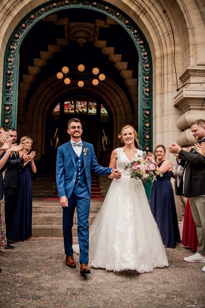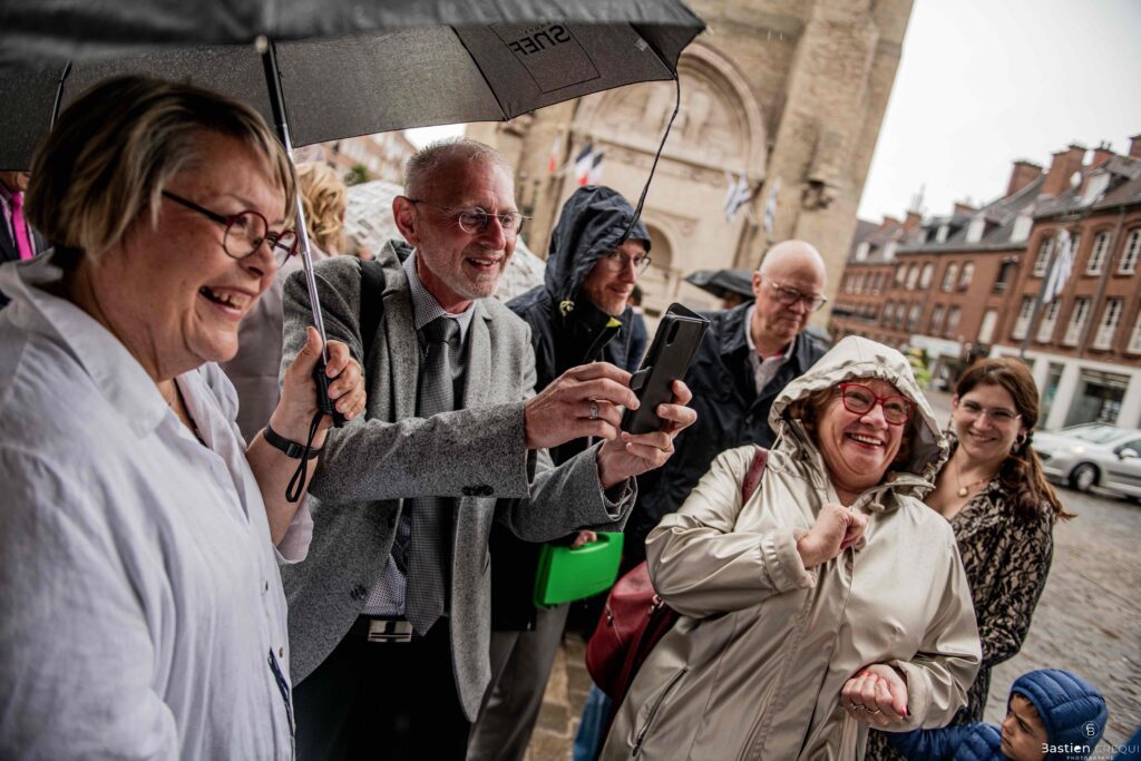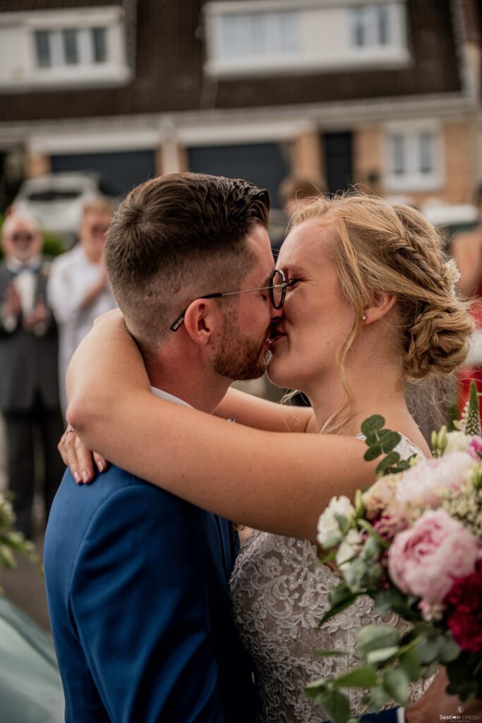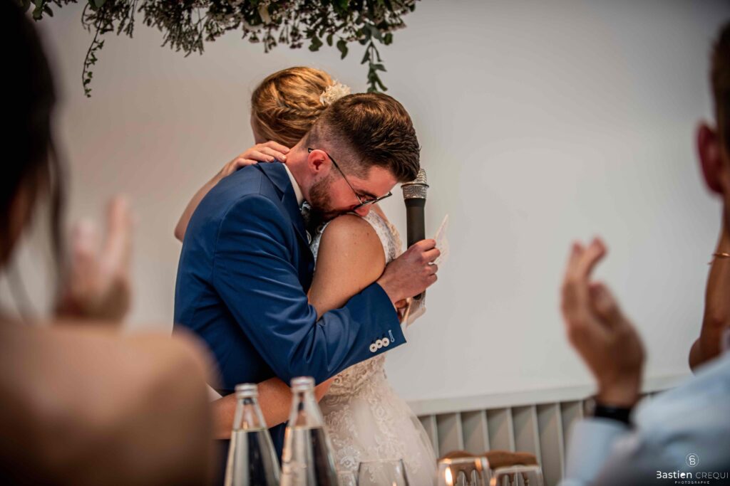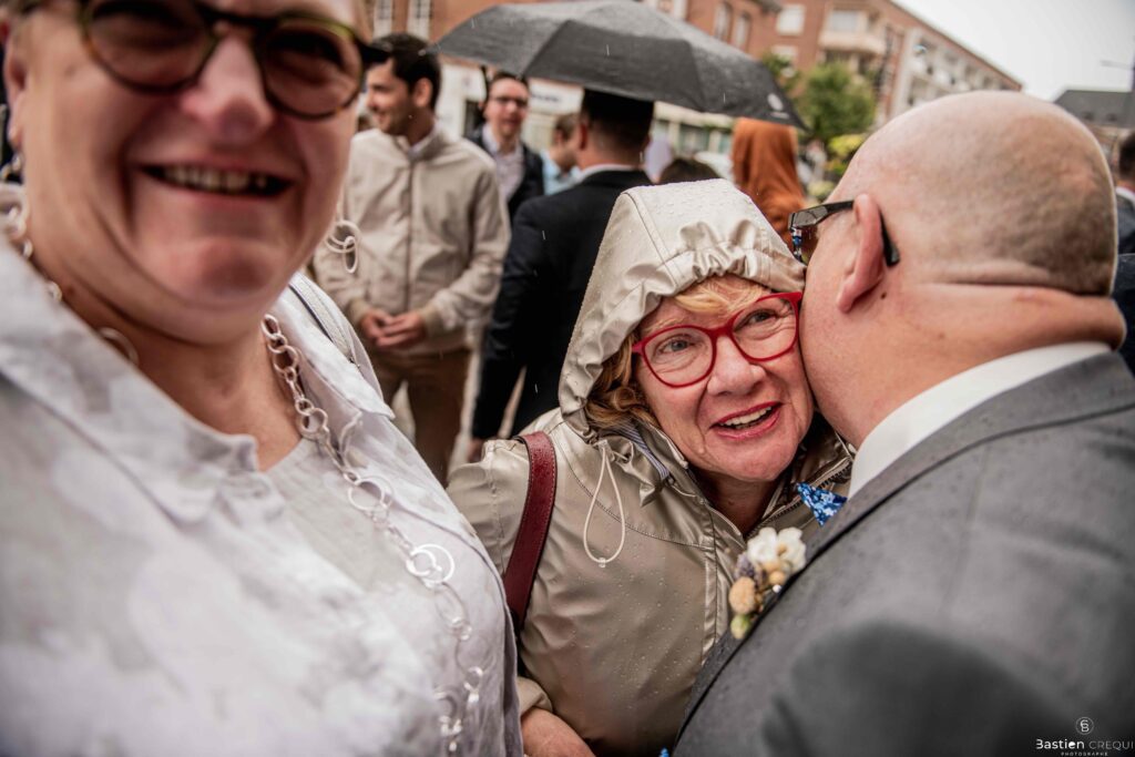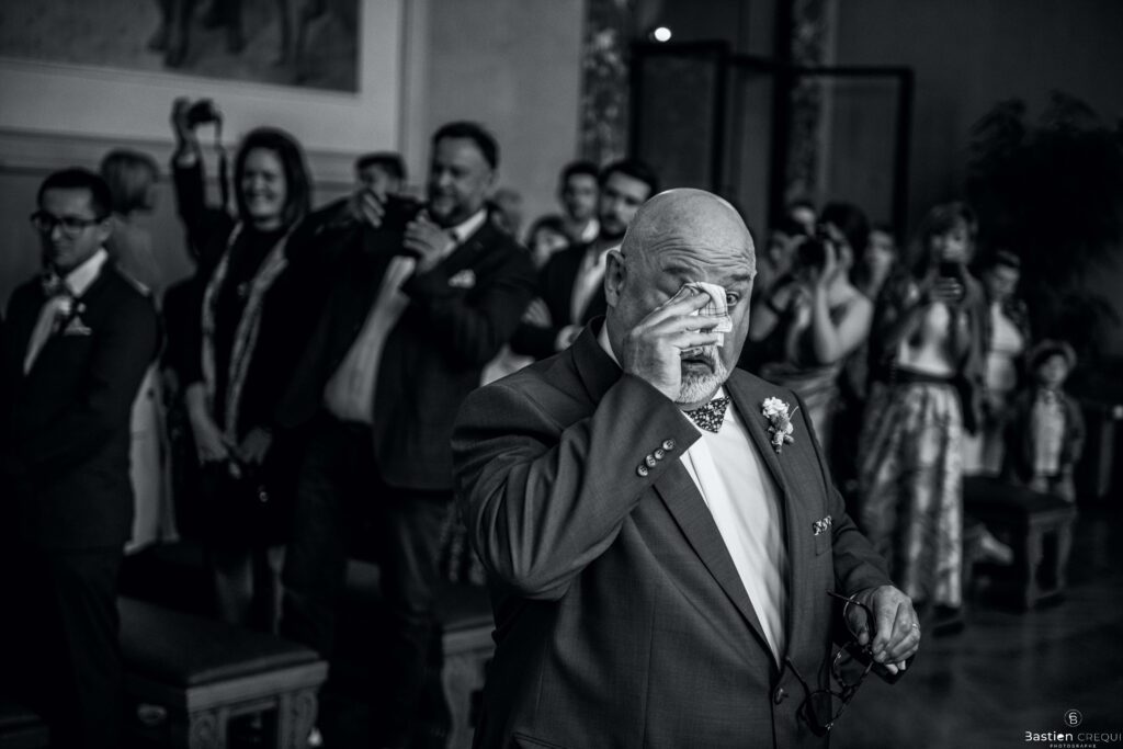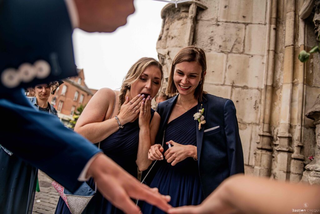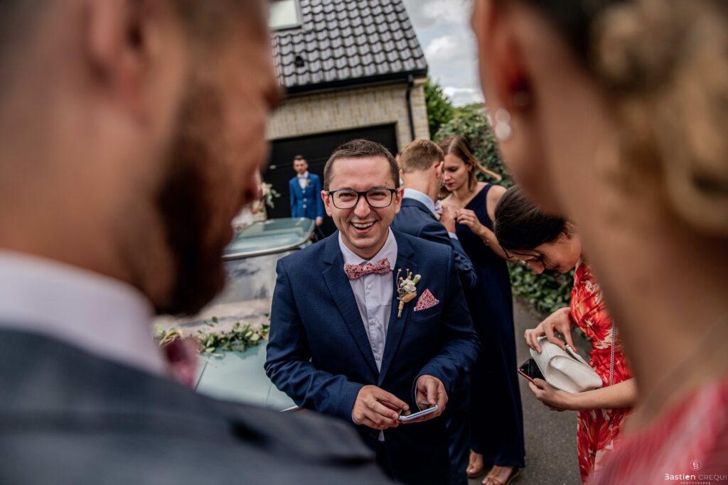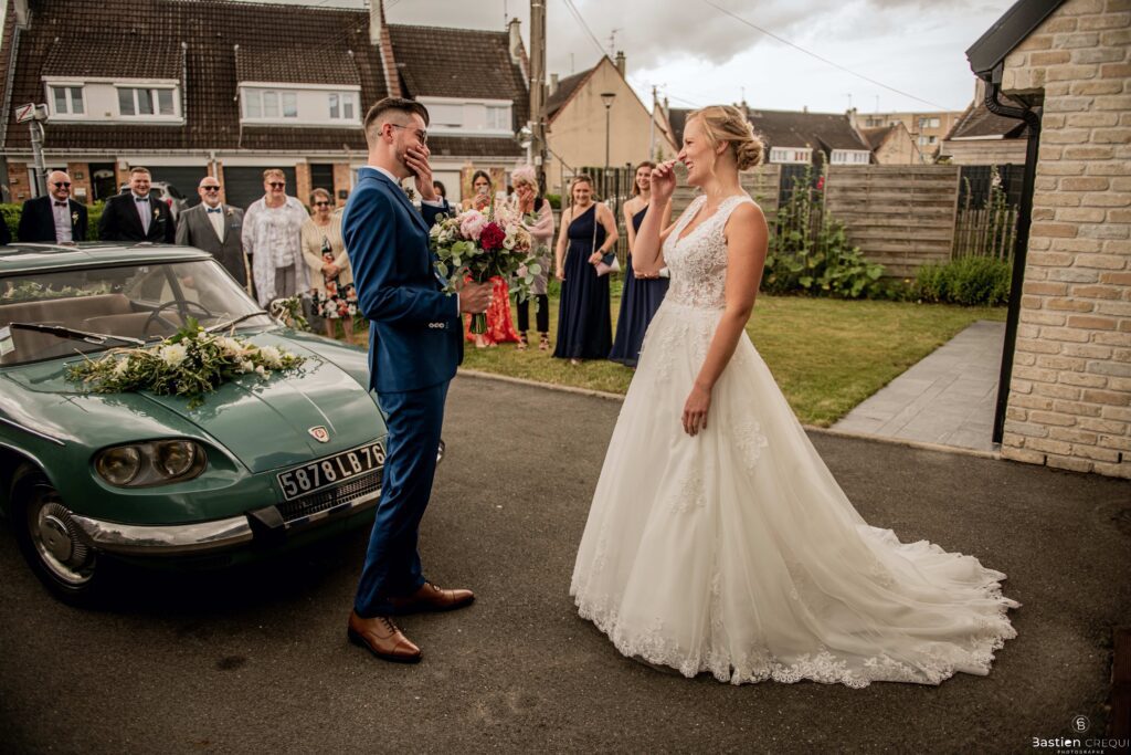 Vient ensuite le moment que tout le monde attend : la découverte des jeunes mariés. Beaucoup d’émotions dans les yeux du couple et dans ceux de leurs proches. Le marié porte un très beau costume de chez Samson Lille