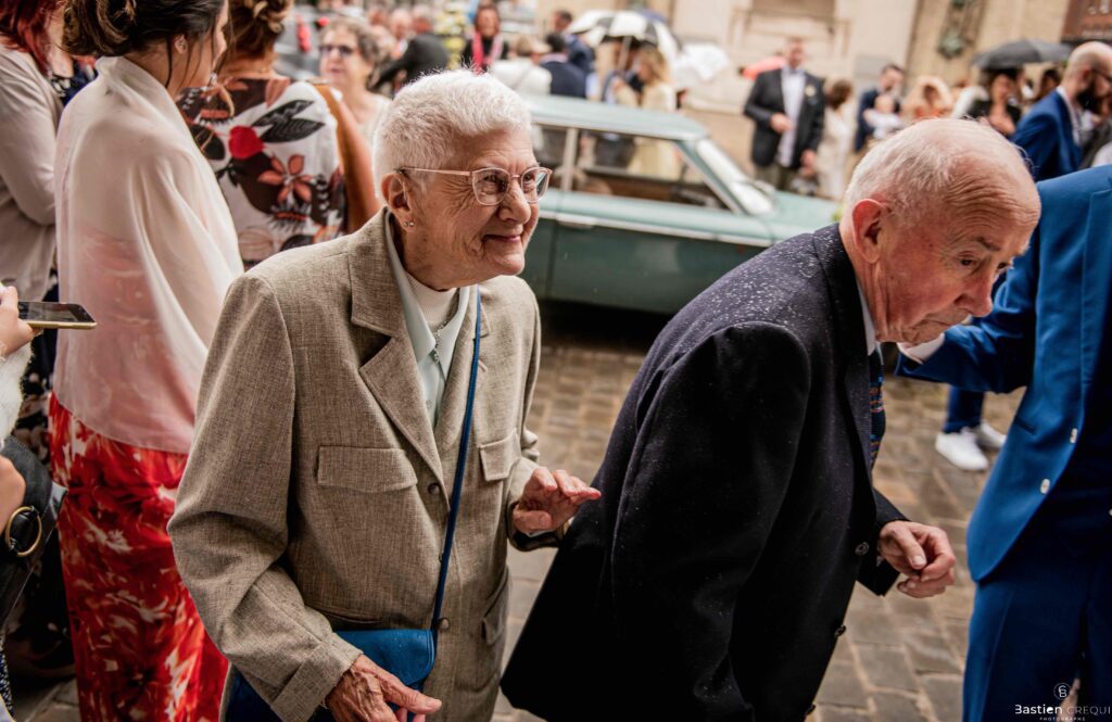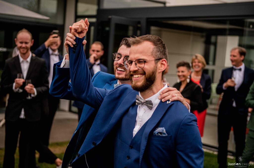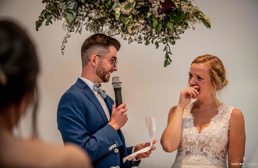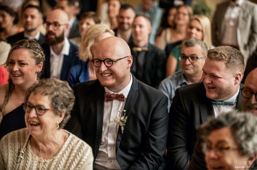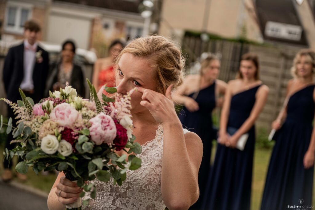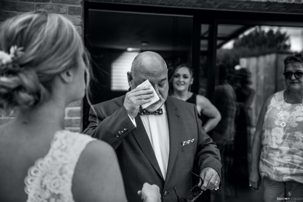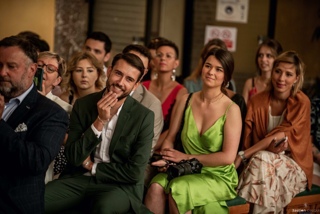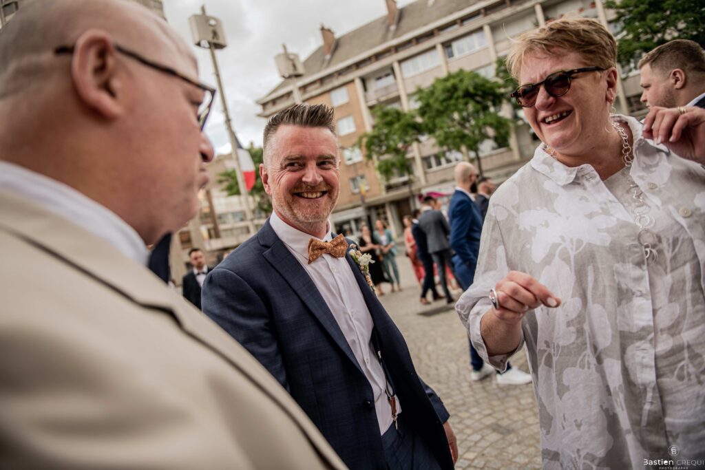 Vient ensuite le moment que tout le monde attend : la découverte des jeunes mariés. Beaucoup d’émotions dans les yeux du couple et dans ceux de leurs proches. Le marié porte un très beau costume de chez Samson Lille