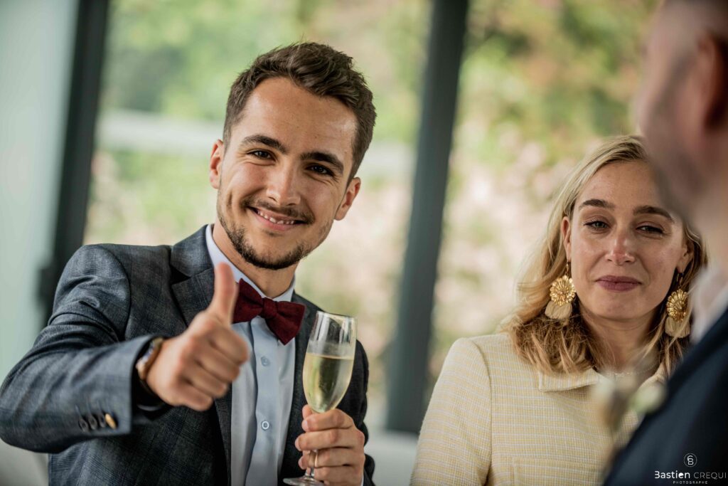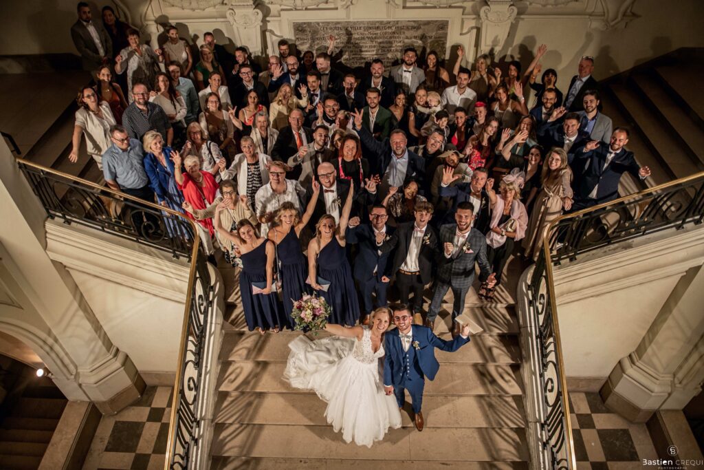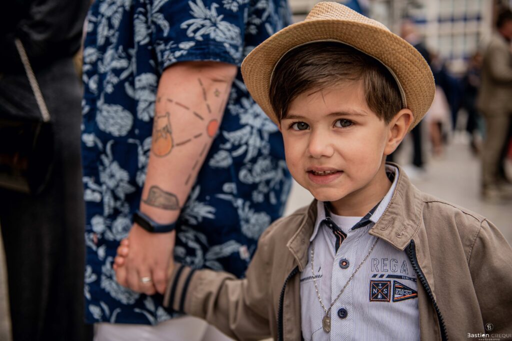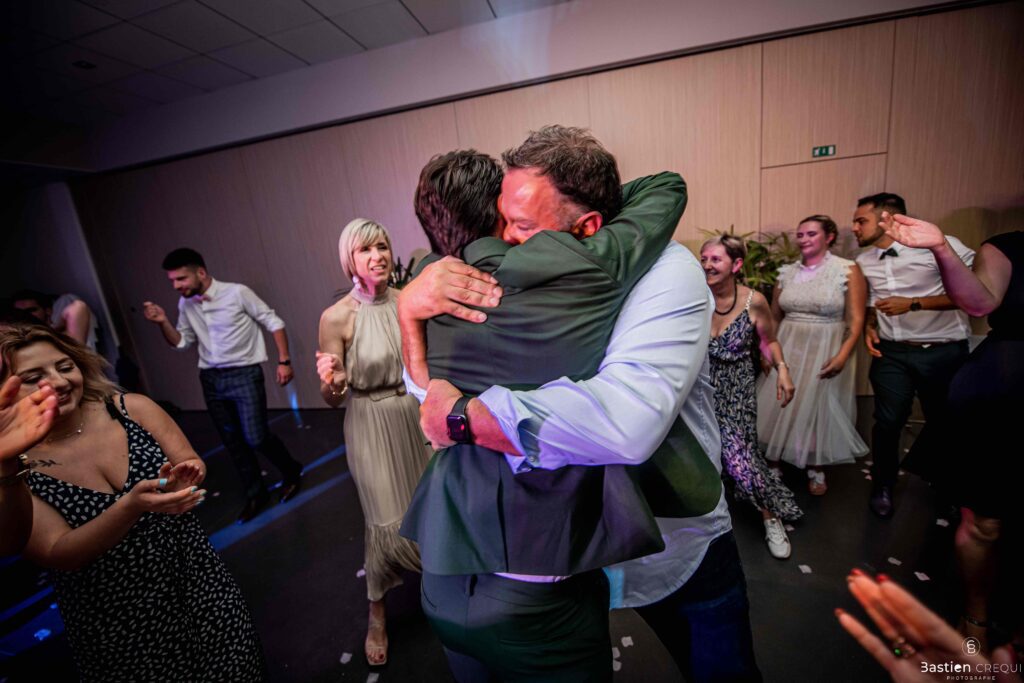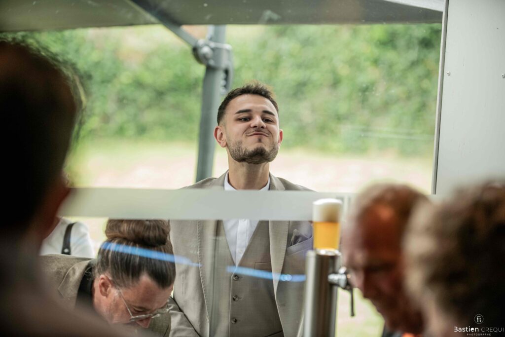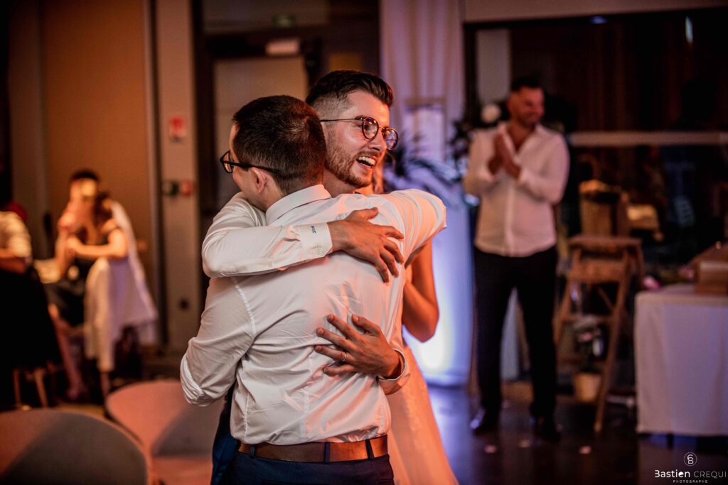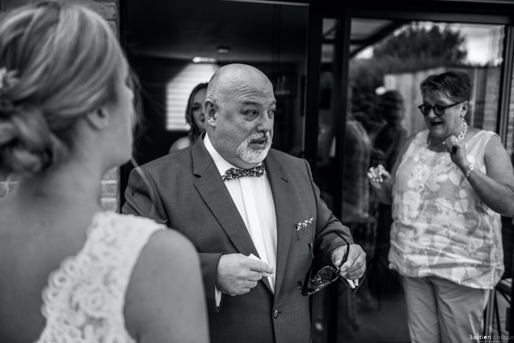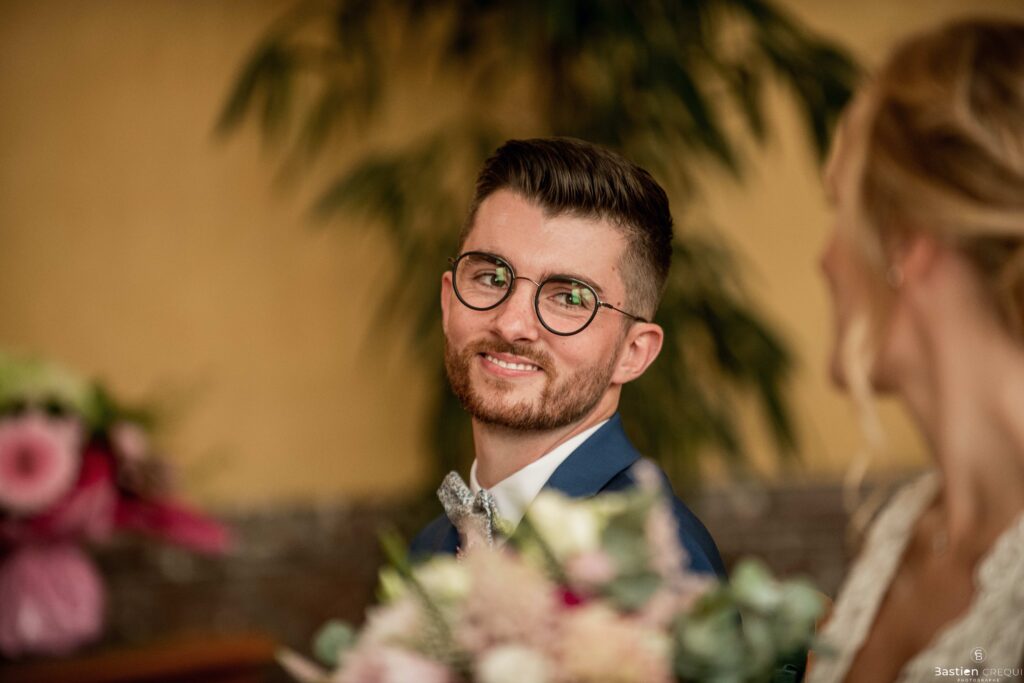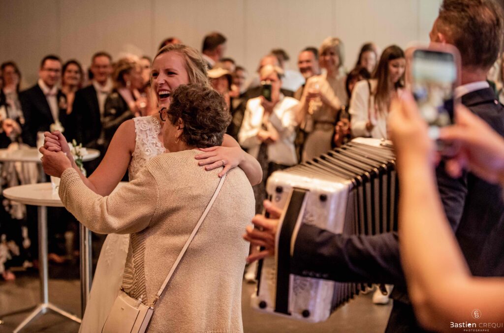Vient ensuite le moment que tout le monde attend : la découverte des jeunes mariés. Beaucoup d’émotions dans les yeux du couple et dans ceux de leurs proches. Le marié porte un très beau costume de chez Samson Lille