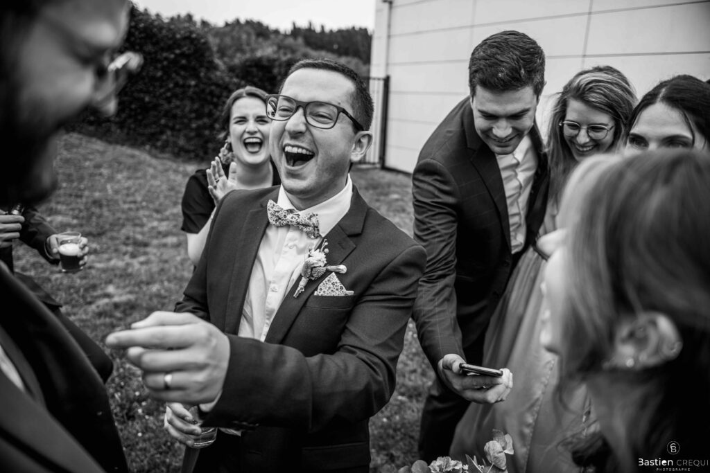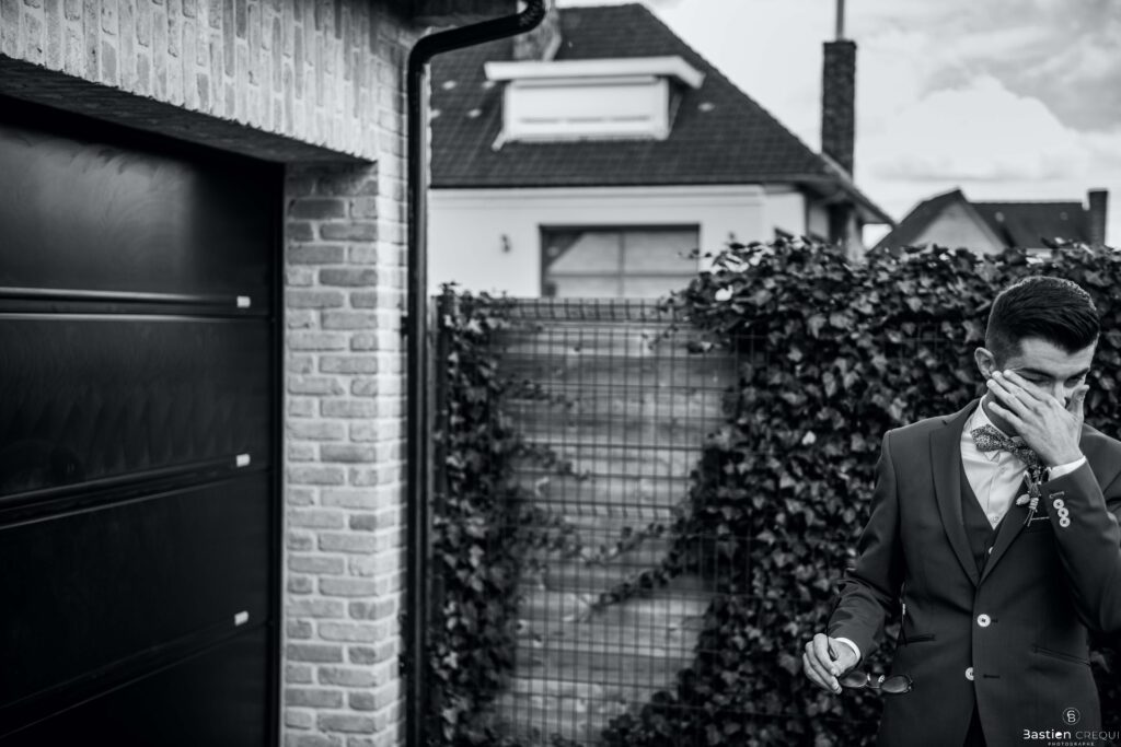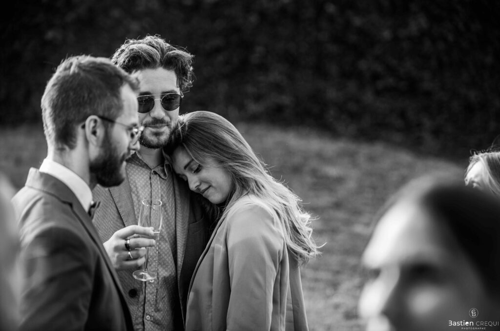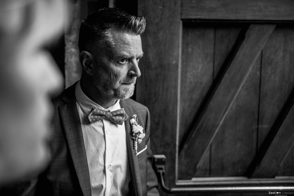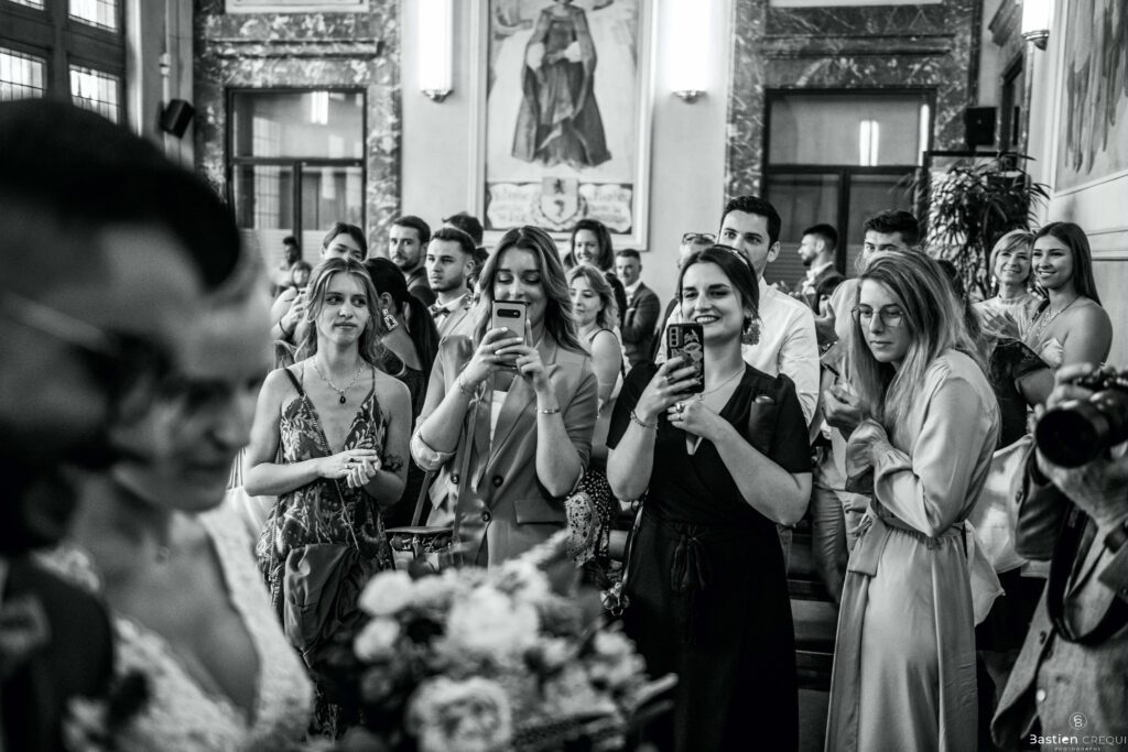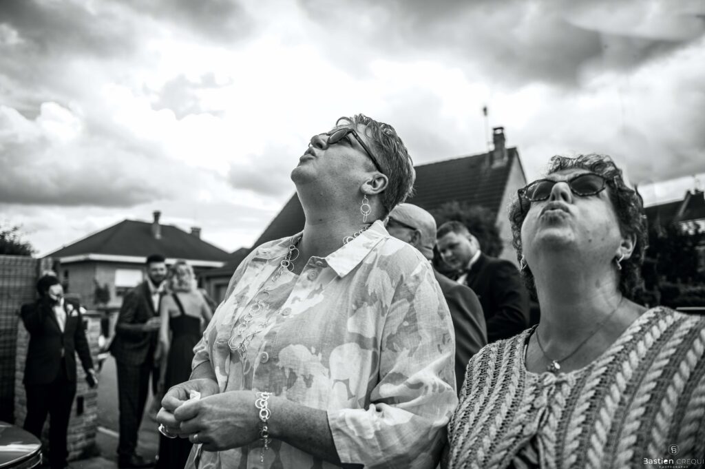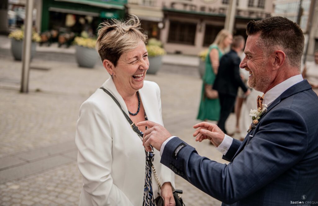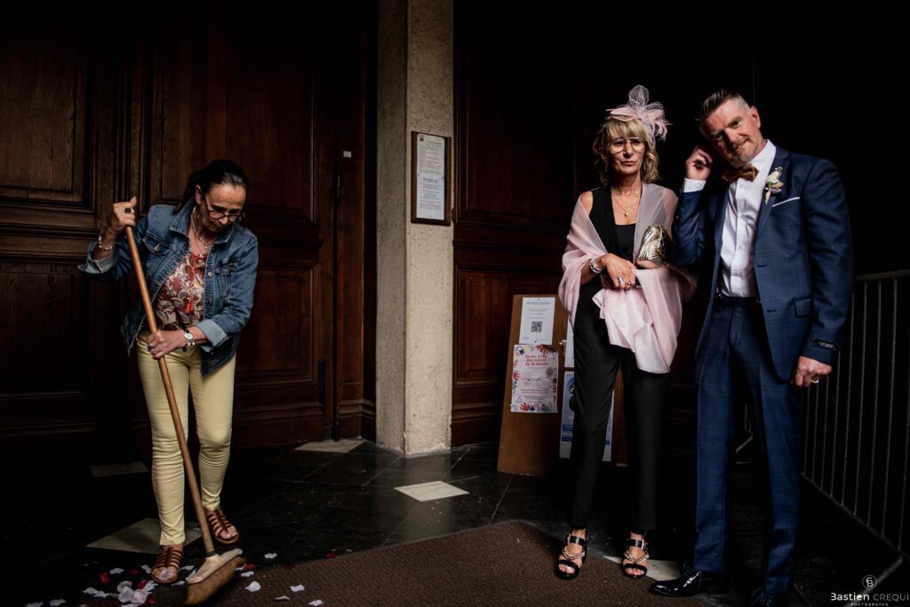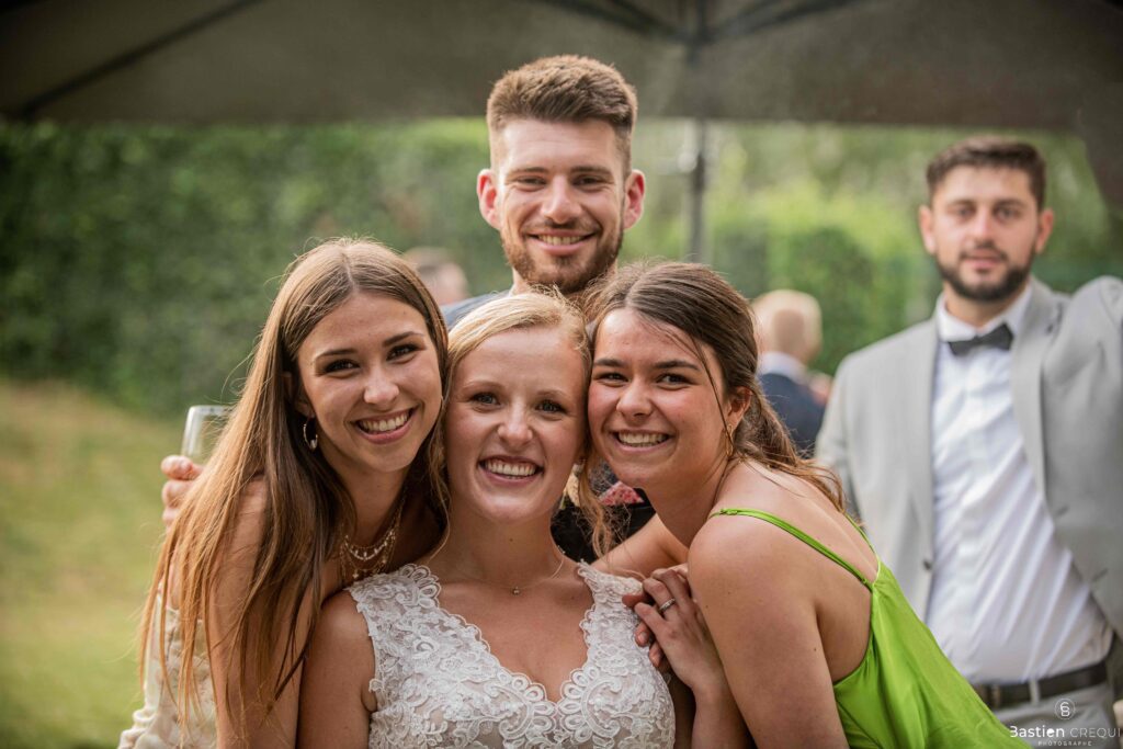 Vient ensuite le moment que tout le monde attend : la découverte des jeunes mariés. Beaucoup d’émotions dans les yeux du couple et dans ceux de leurs proches. Le marié porte un très beau costume de chez Samson Lille