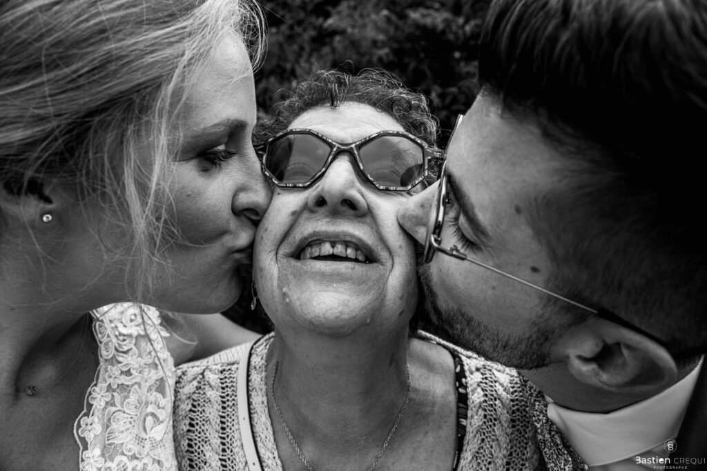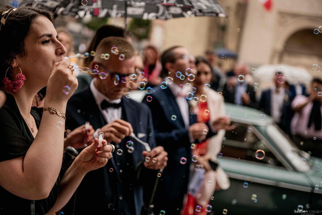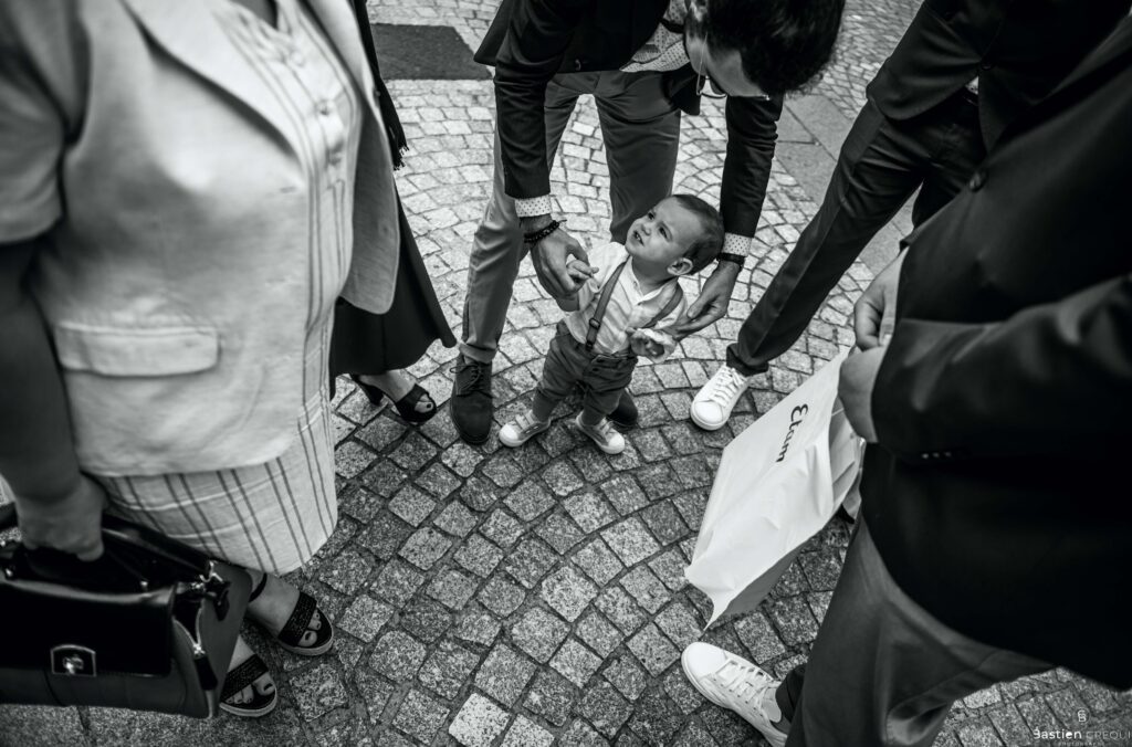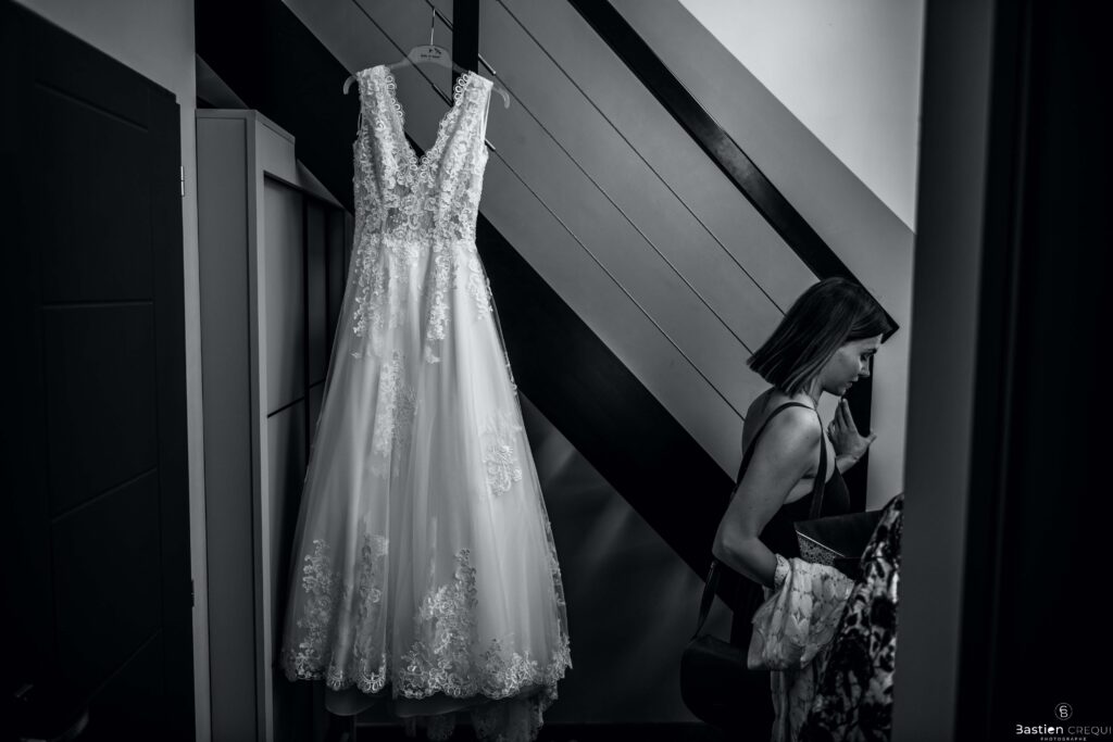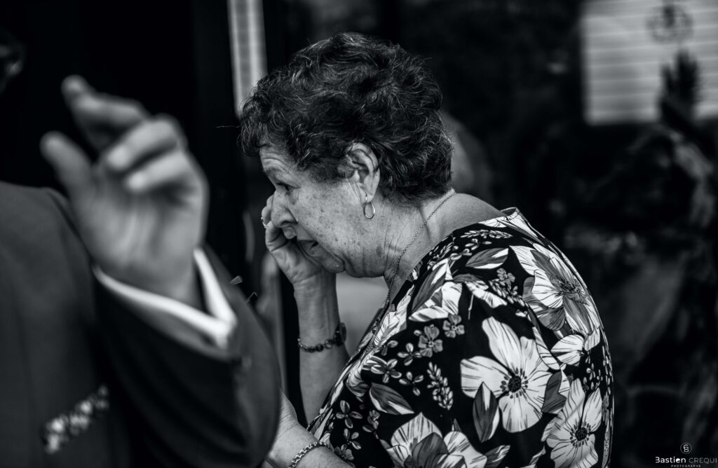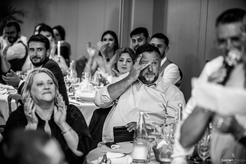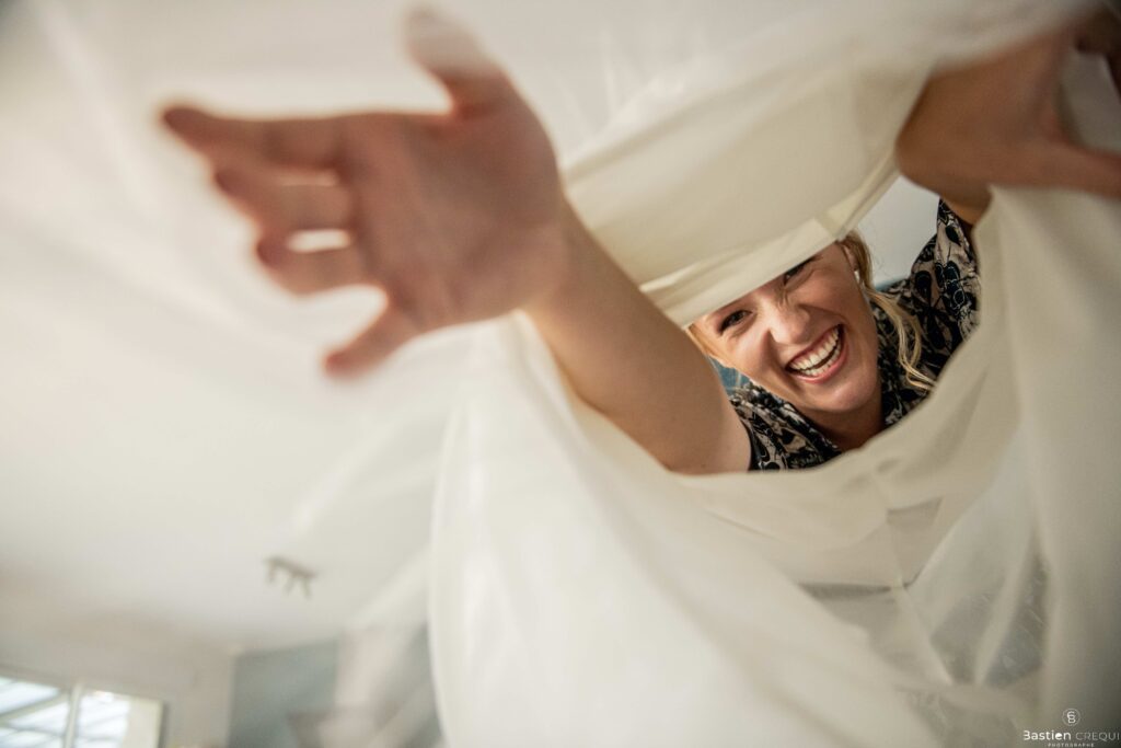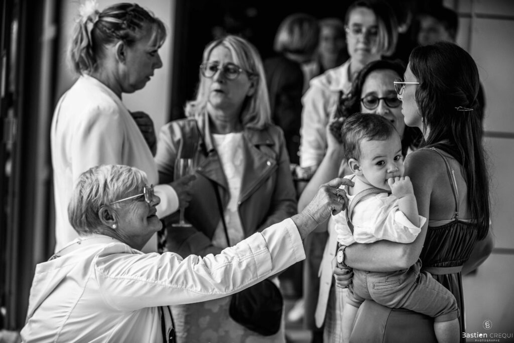 Vient ensuite le moment que tout le monde attend : la découverte des jeunes mariés. Beaucoup d’émotions dans les yeux du couple et dans ceux de leurs proches. Le marié porte un très beau costume de chez Samson Lille