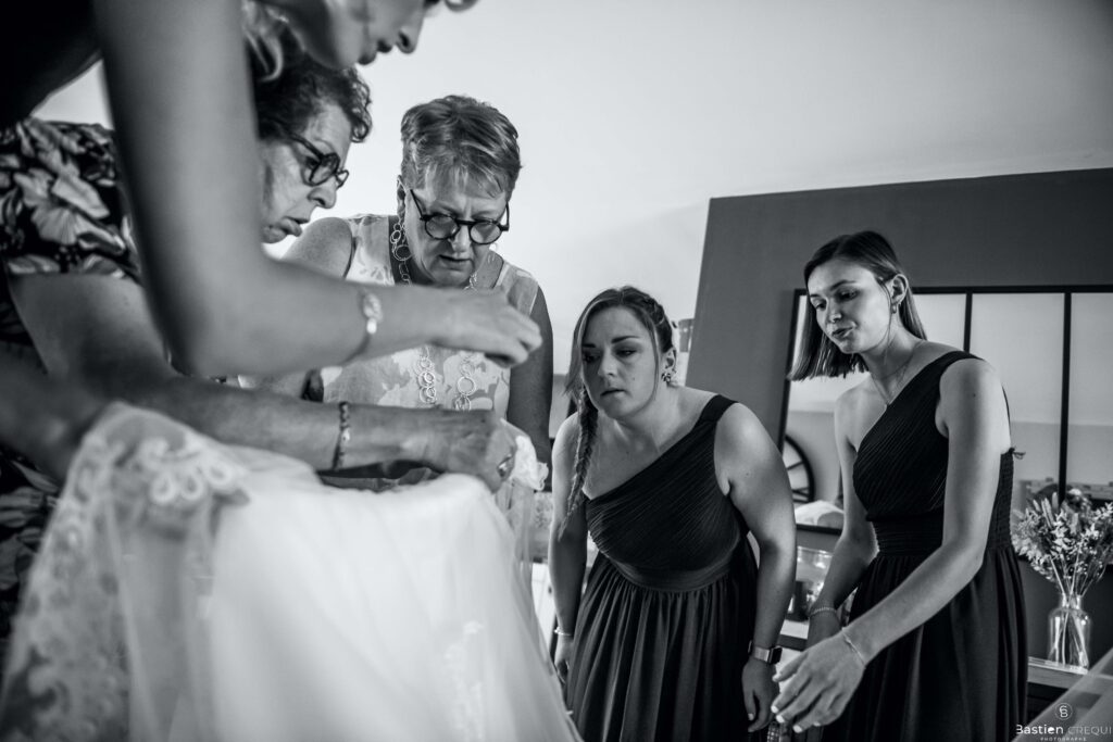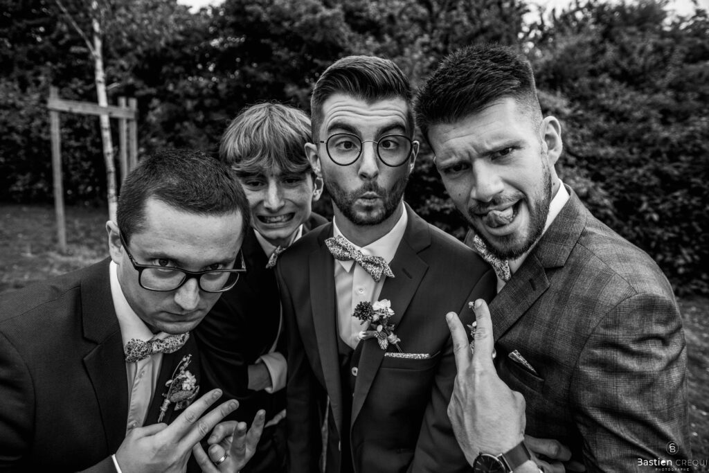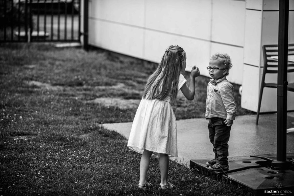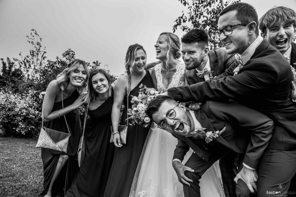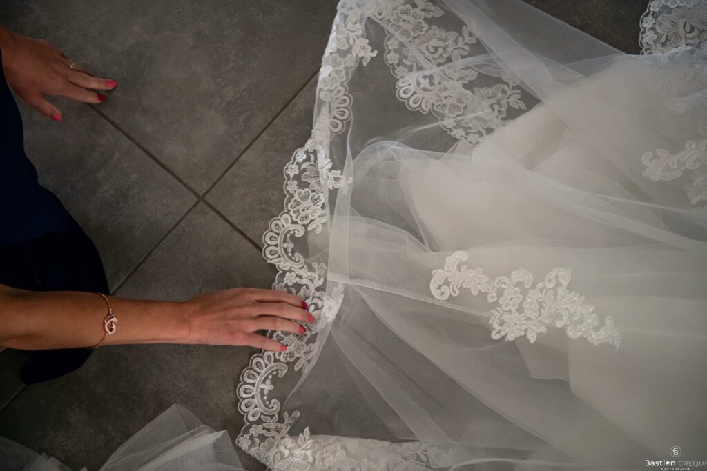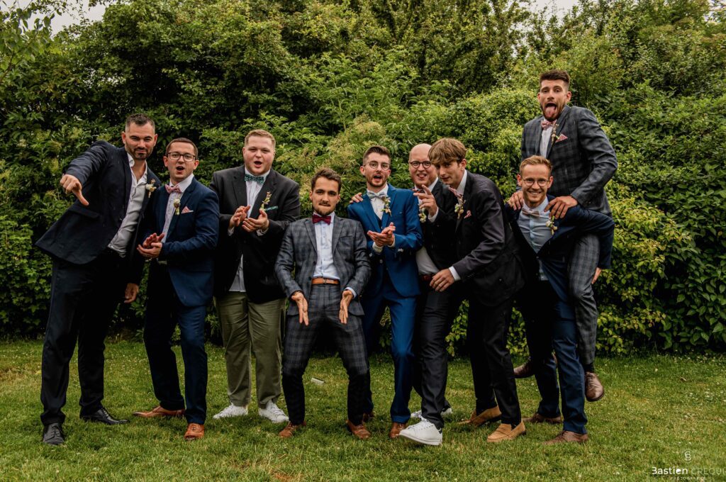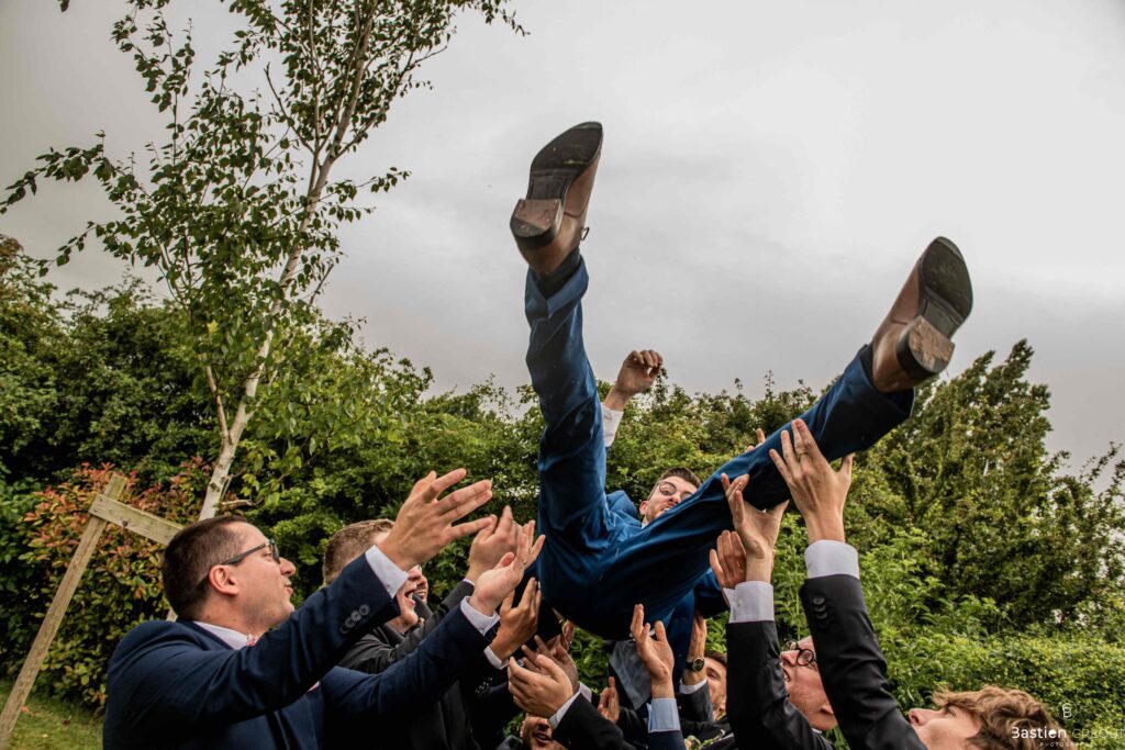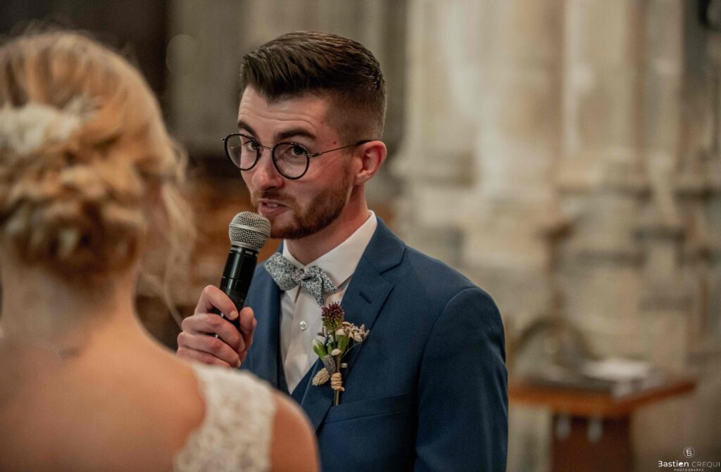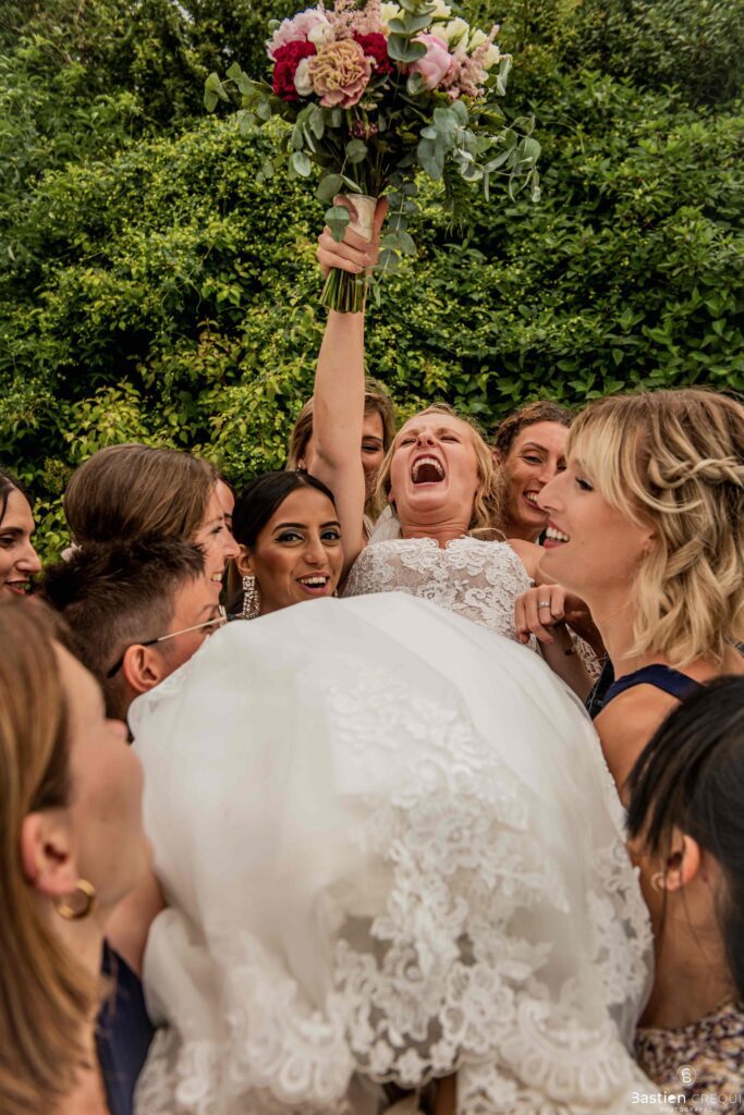 Vient ensuite le moment que tout le monde attend : la découverte des jeunes mariés. Beaucoup d’émotions dans les yeux du couple et dans ceux de leurs proches. Le marié porte un très beau costume de chez Samson Lille