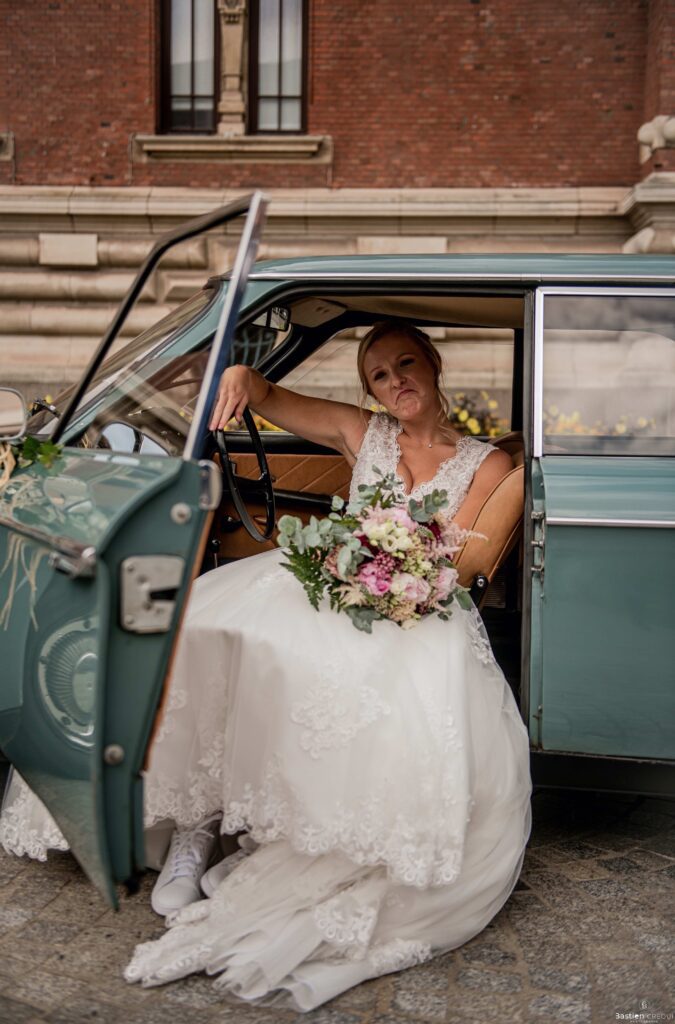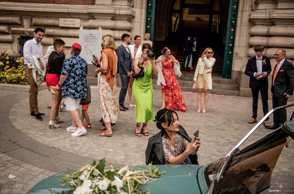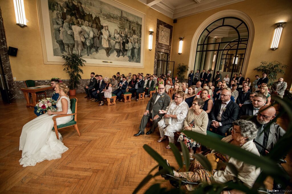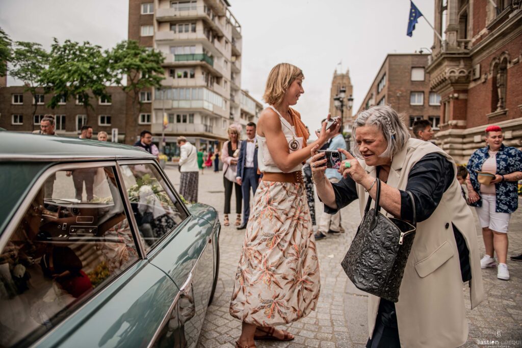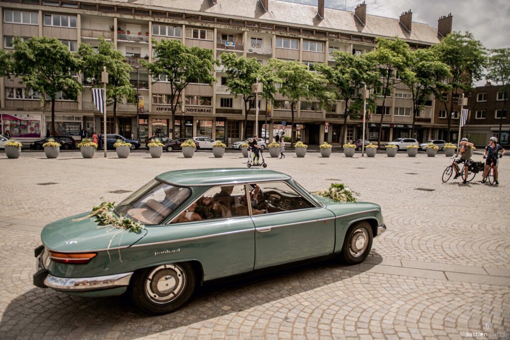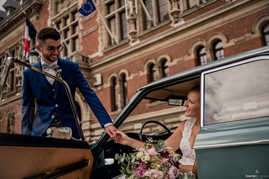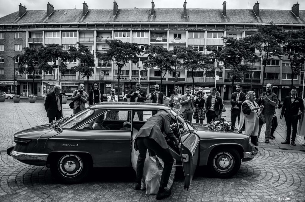 Direction la cérémonie civile à la mairie de Dunkerque en véhicule de collection (Panhard). L’occasion pour moi de prendre quelques photos posées du couple avec la voiture avant de capturer les arrivées des proches sur le parvis de la mairie de Dunkerque. La cérémonie s’est déroulé dans la magnifique salle des mariages de Dunkerque.