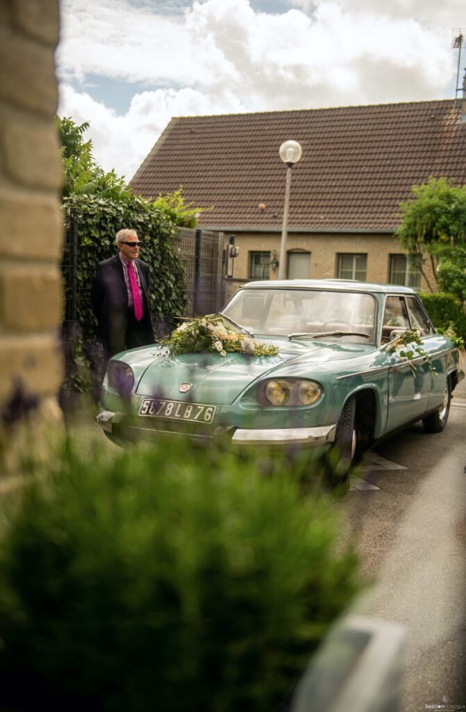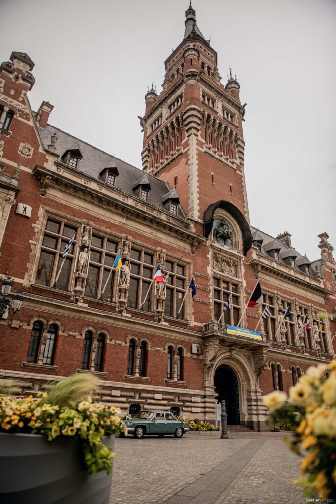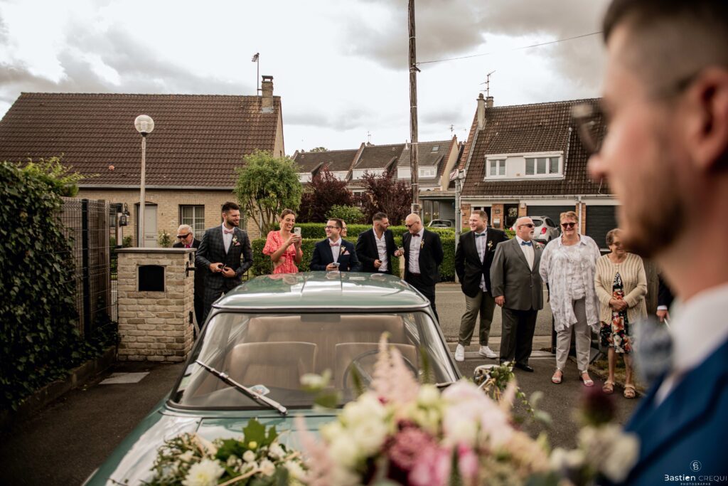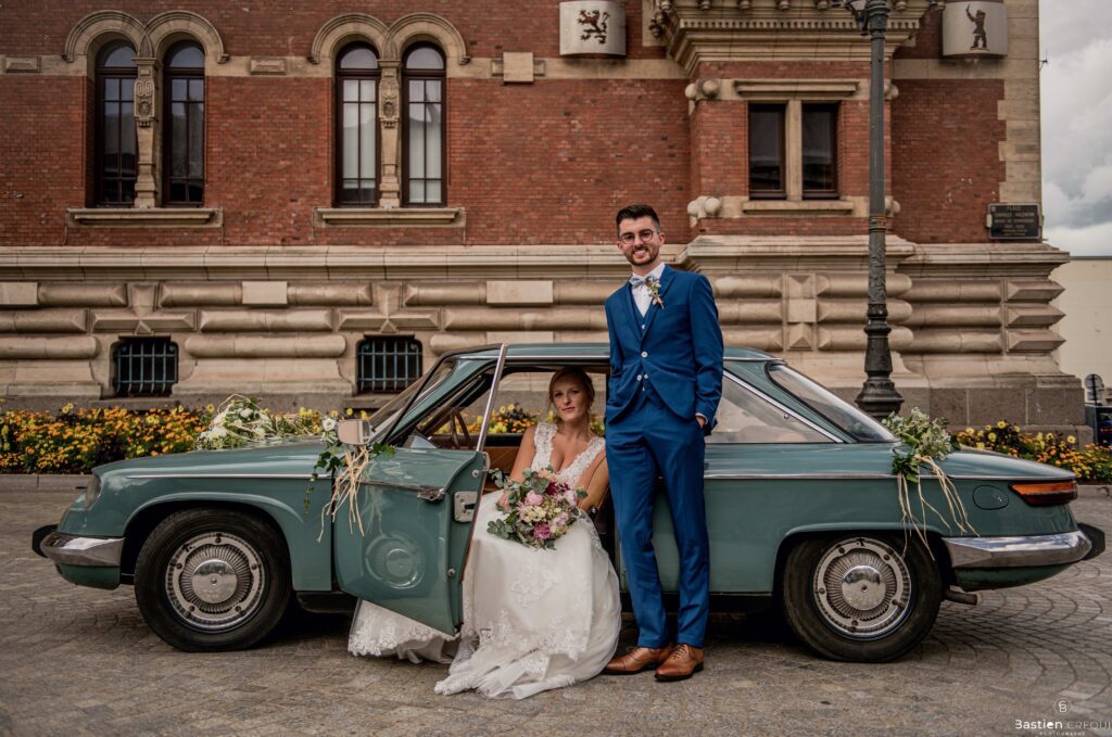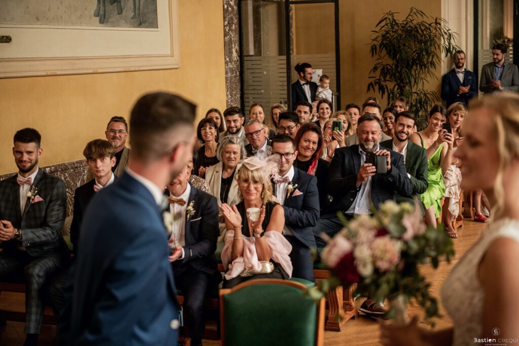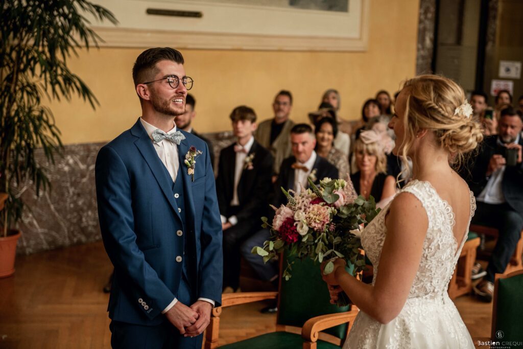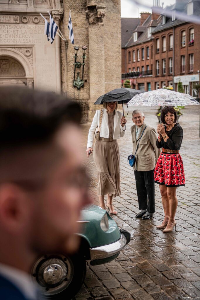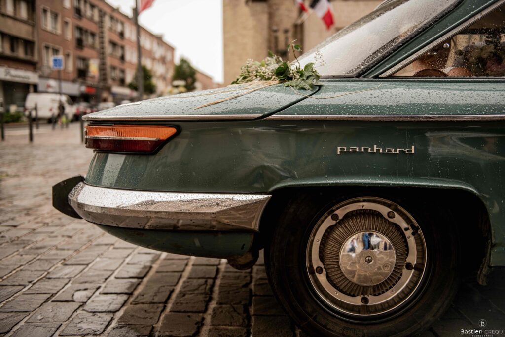 Direction la cérémonie civile à la mairie de Dunkerque en véhicule de collection (Panhard). L’occasion pour moi de prendre quelques photos posées du couple avec la voiture avant de capturer les arrivées des proches sur le parvis de la mairie de Dunkerque. La cérémonie s’est déroulé dans la magnifique salle des mariages de Dunkerque.
