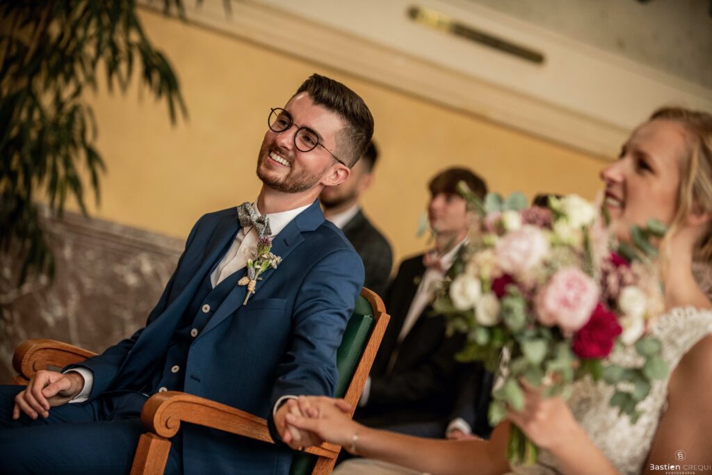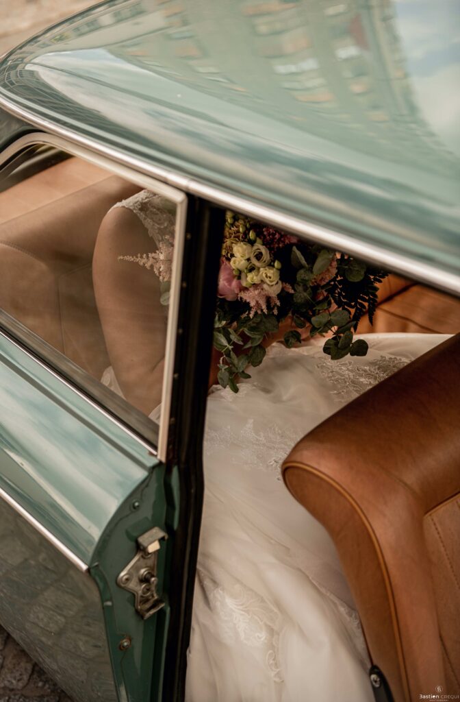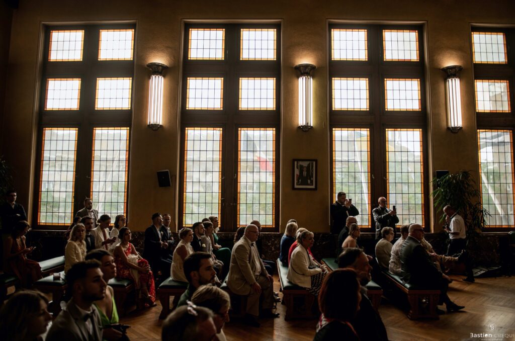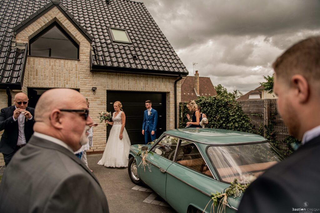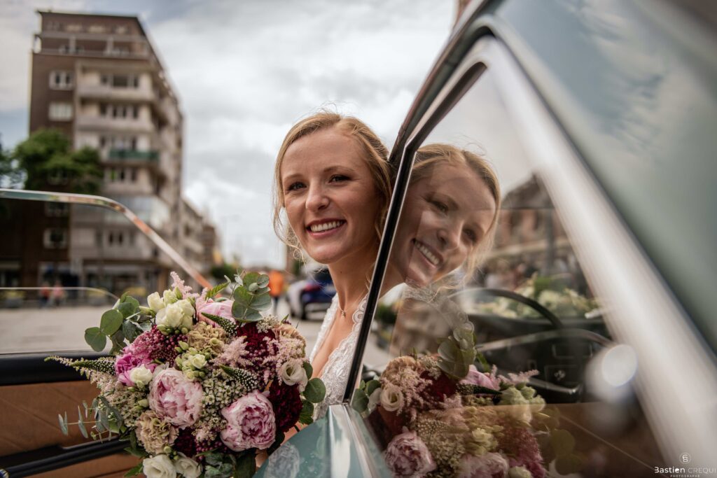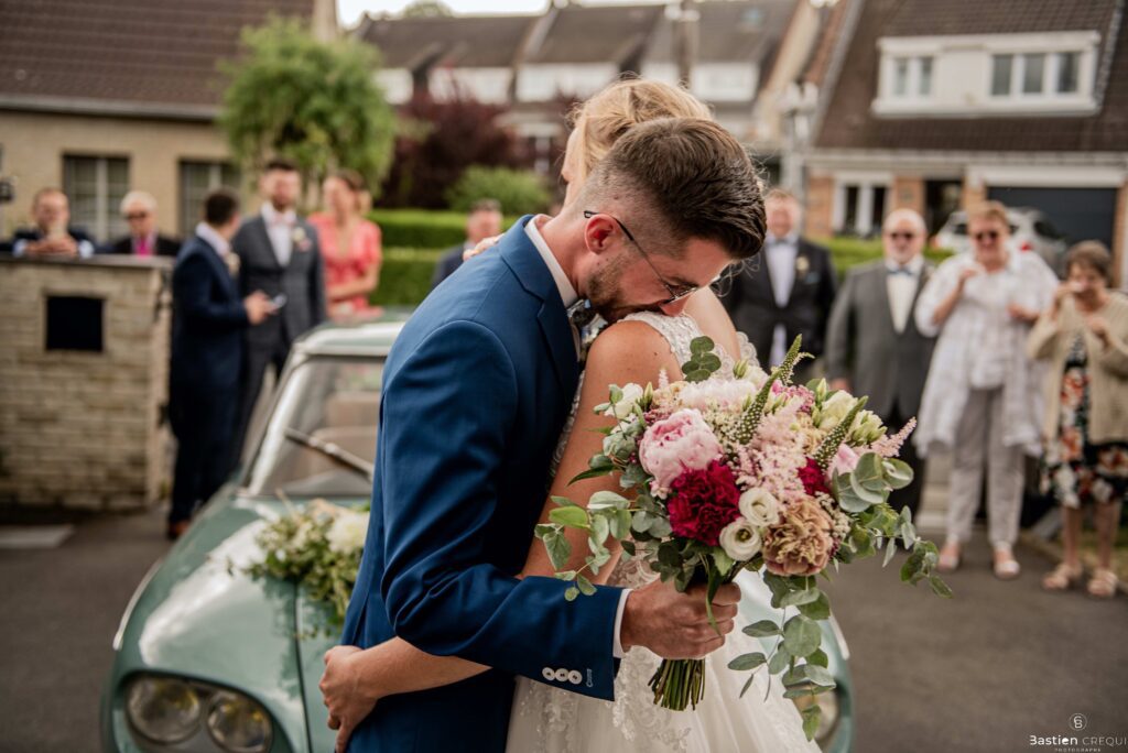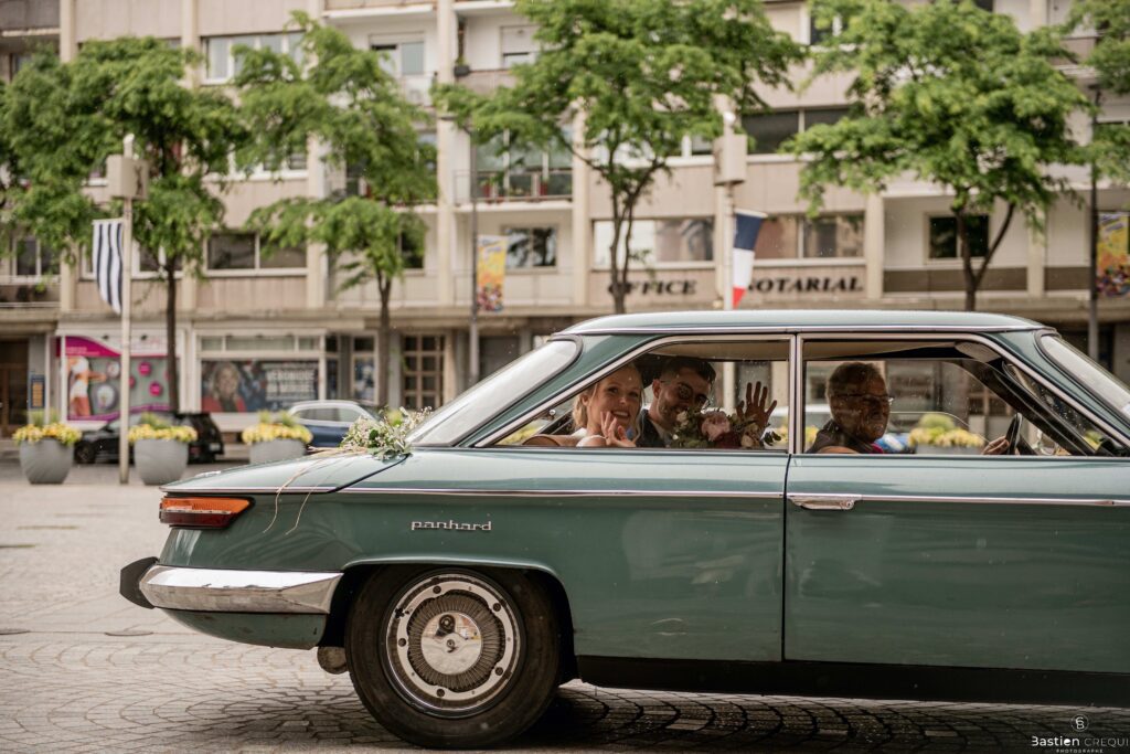 Direction la cérémonie civile à la mairie de Dunkerque en véhicule de collection (Panhard). L’occasion pour moi de prendre quelques photos posées du couple avec la voiture avant de capturer les arrivées des proches sur le parvis de la mairie de Dunkerque. La cérémonie s’est déroulé dans la magnifique salle des mariages de Dunkerque.