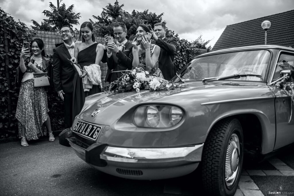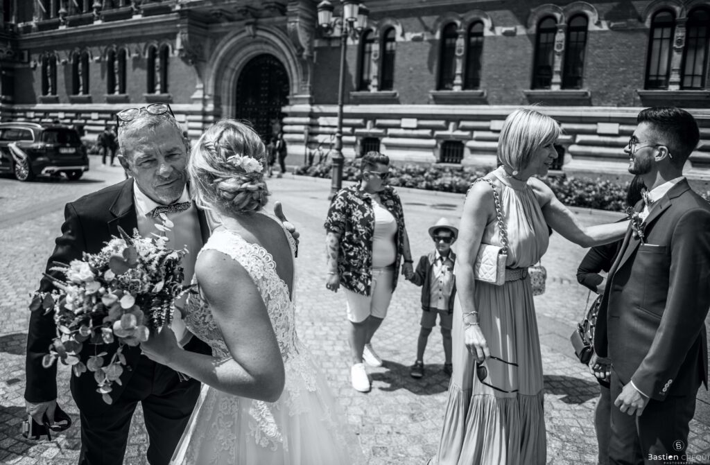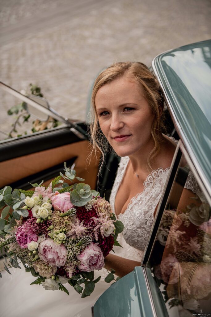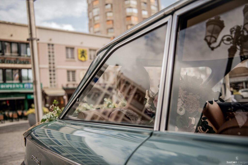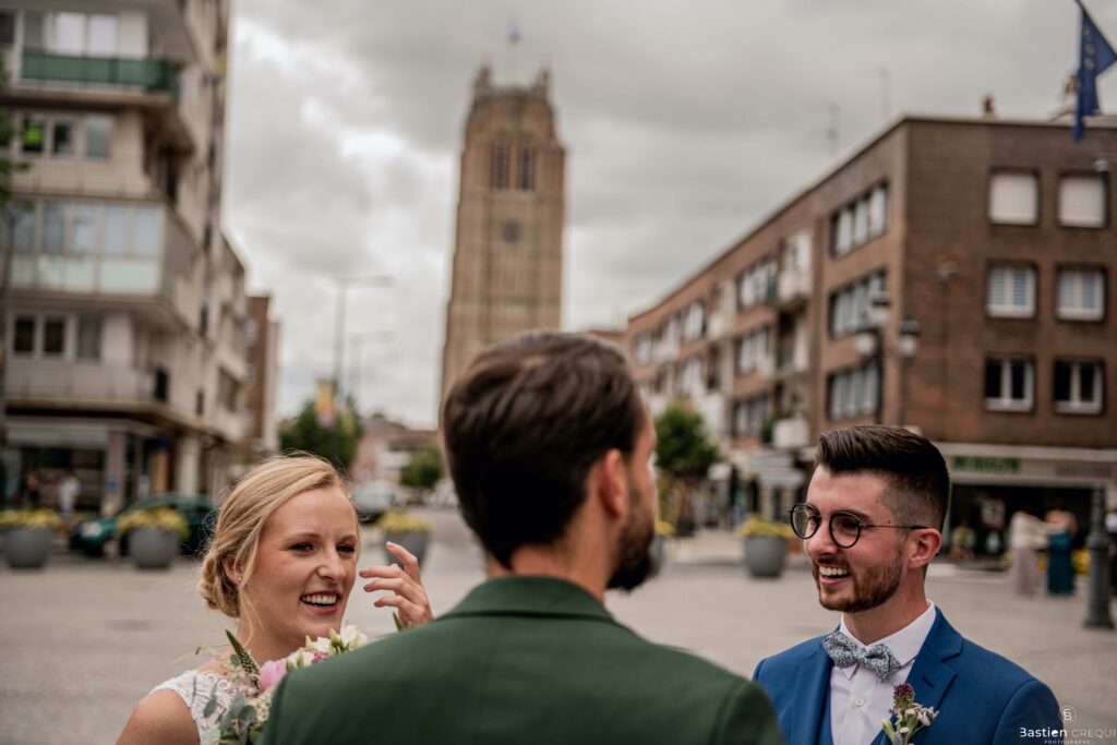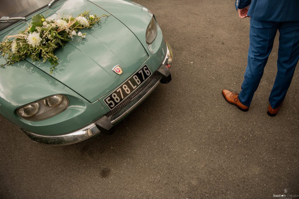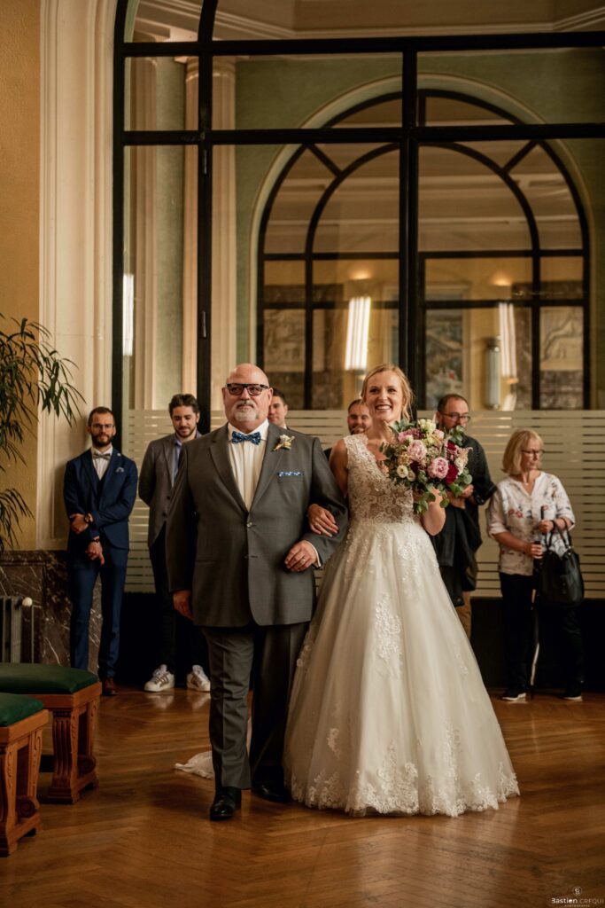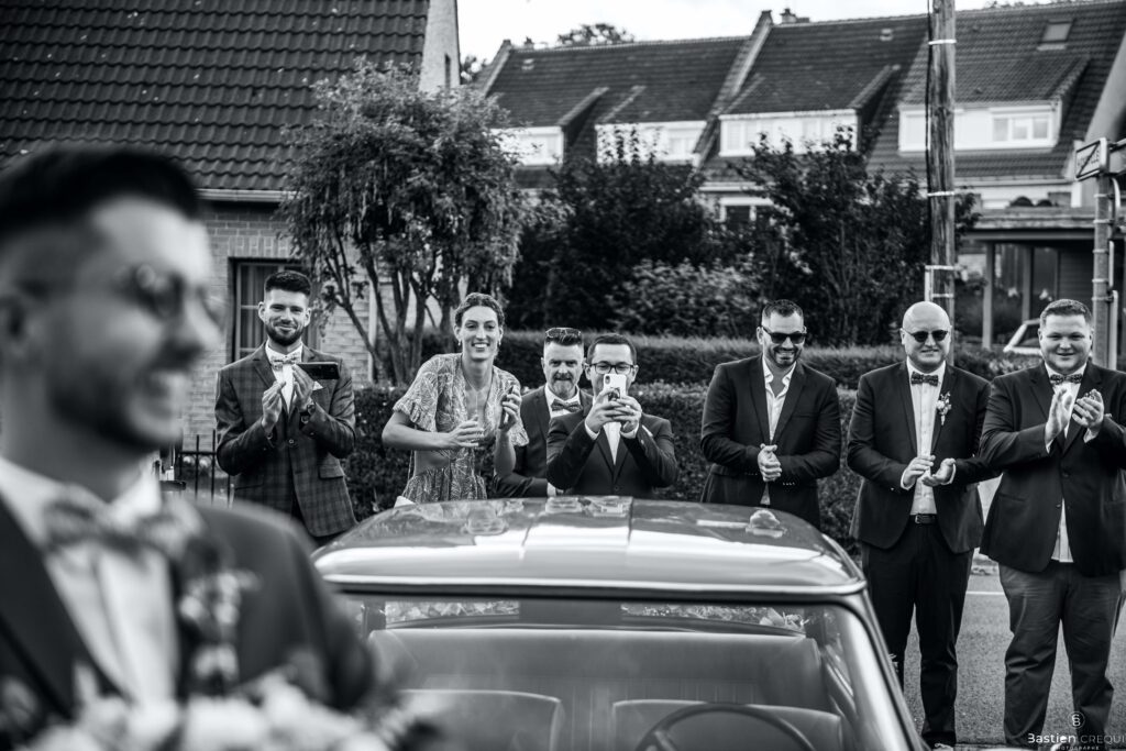 Direction la cérémonie civile à la mairie de Dunkerque en véhicule de collection (Panhard). L’occasion pour moi de prendre quelques photos posées du couple avec la voiture avant de capturer les arrivées des proches sur le parvis de la mairie de Dunkerque. La cérémonie s’est déroulé dans la magnifique salle des mariages de Dunkerque.