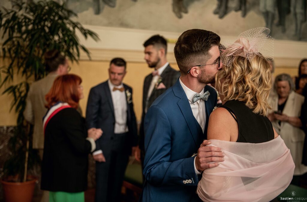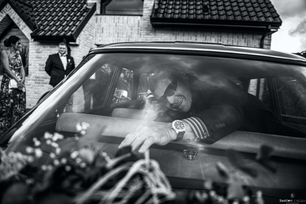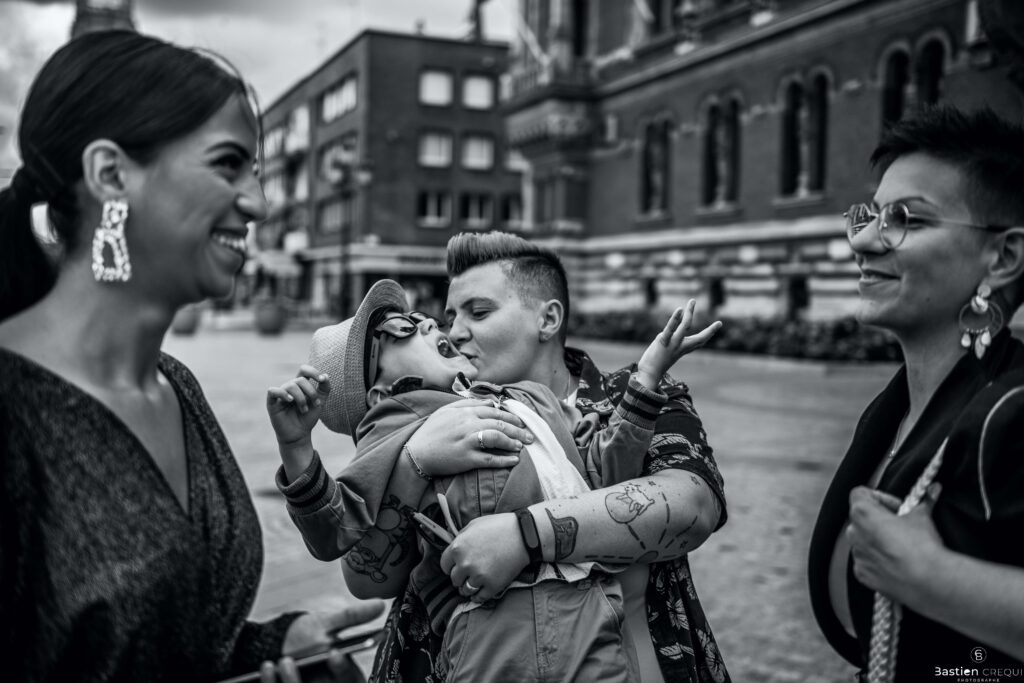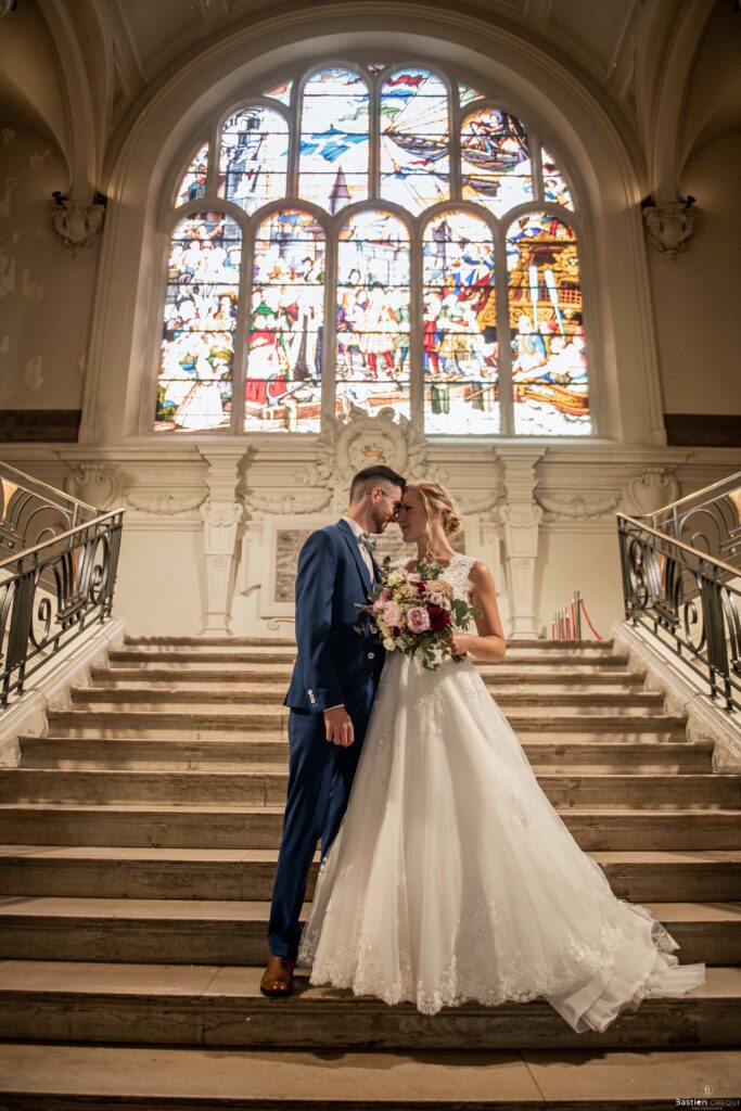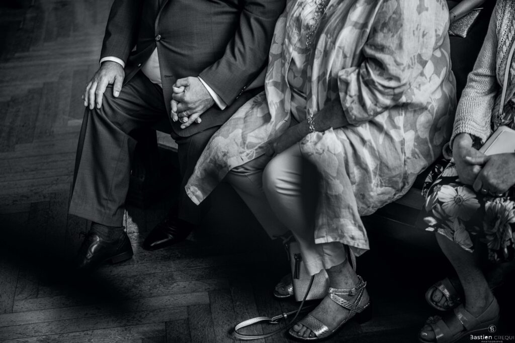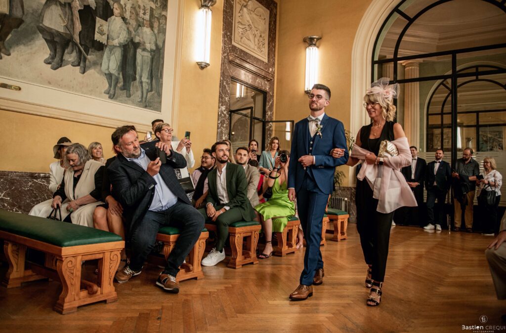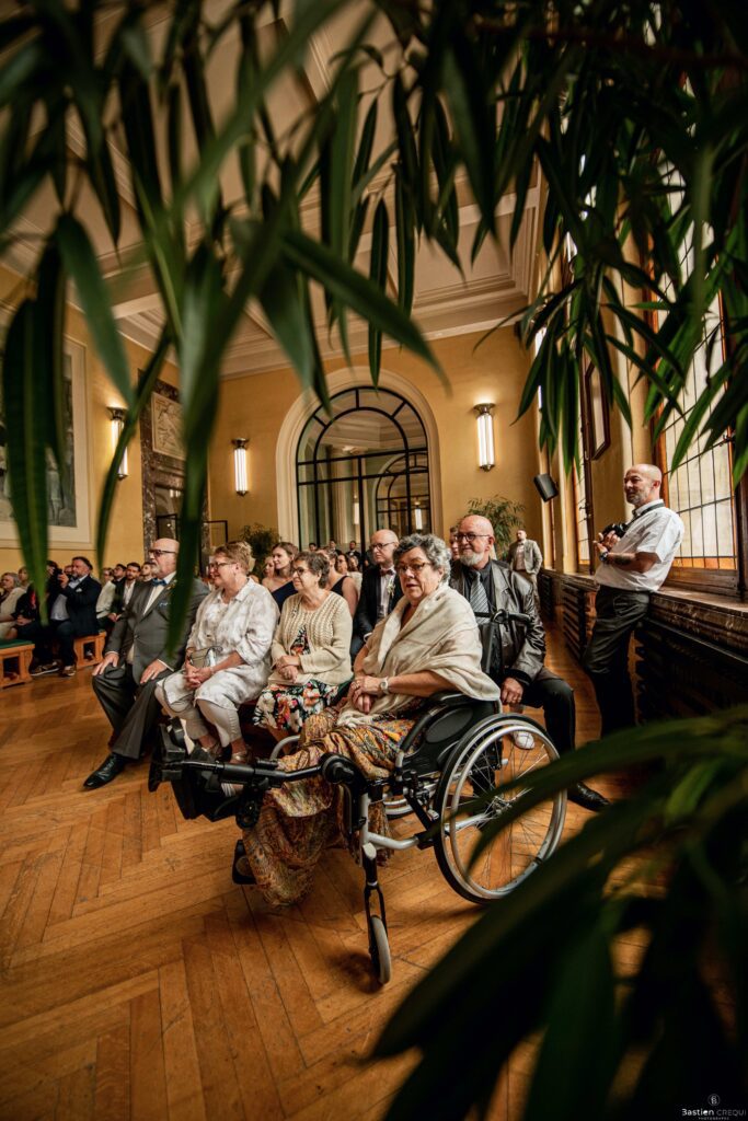 Direction la cérémonie civile à la mairie de Dunkerque en véhicule de collection (Panhard). L’occasion pour moi de prendre quelques photos posées du couple avec la voiture avant de capturer les arrivées des proches sur le parvis de la mairie de Dunkerque. La cérémonie s’est déroulé dans la magnifique salle des mariages de Dunkerque.