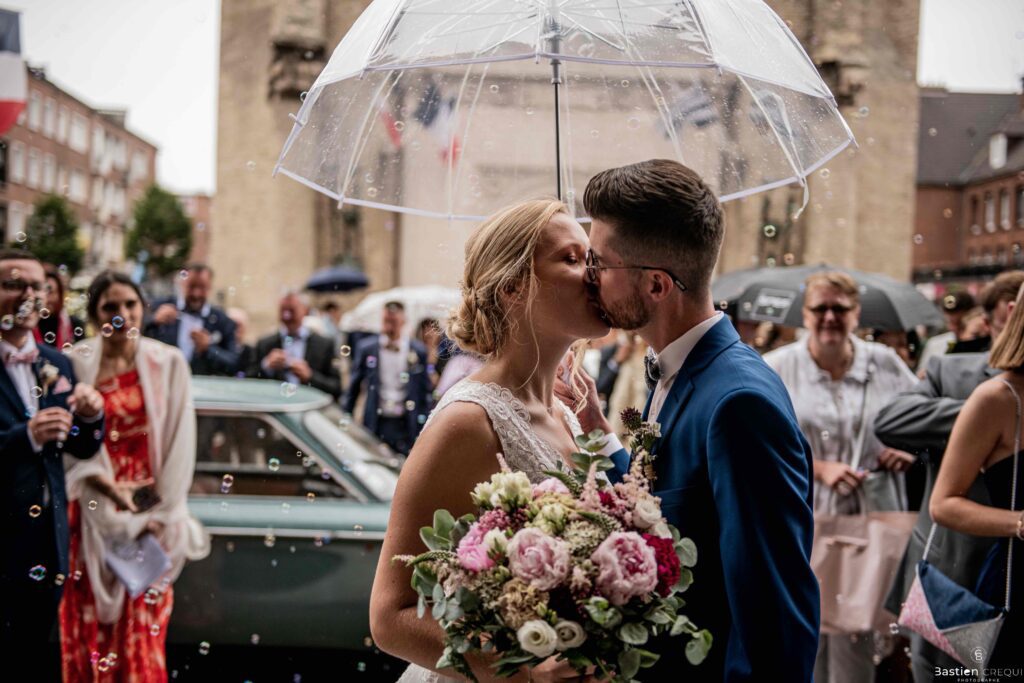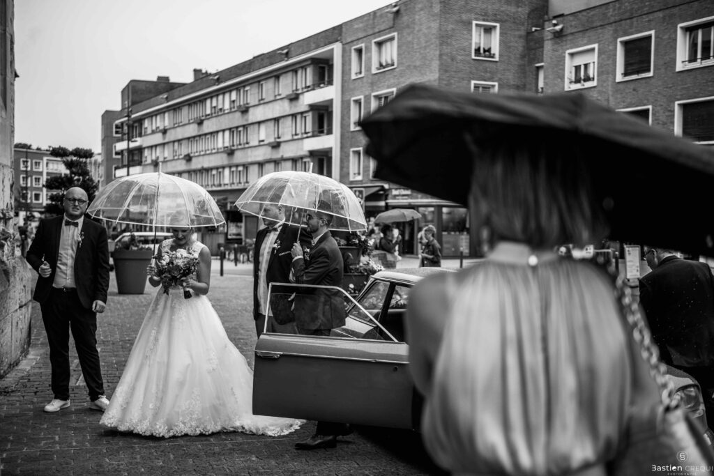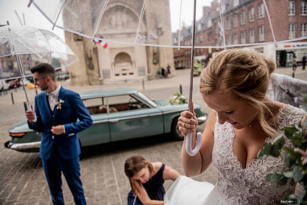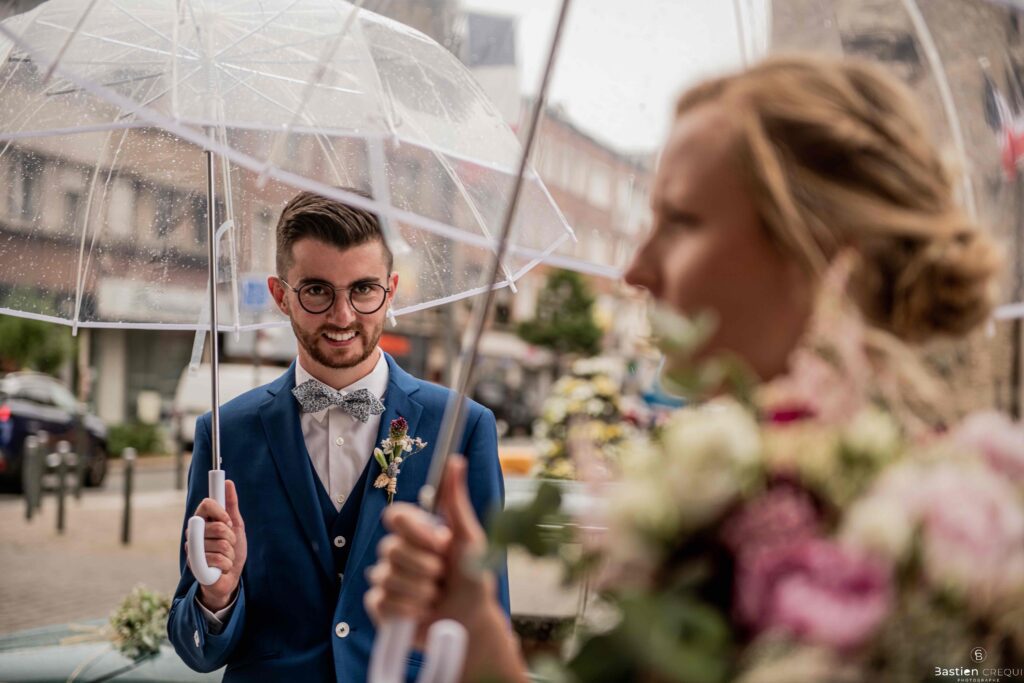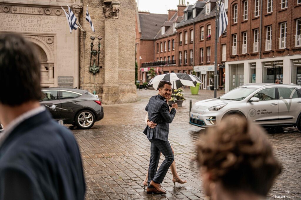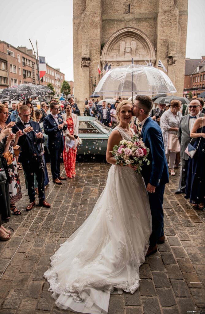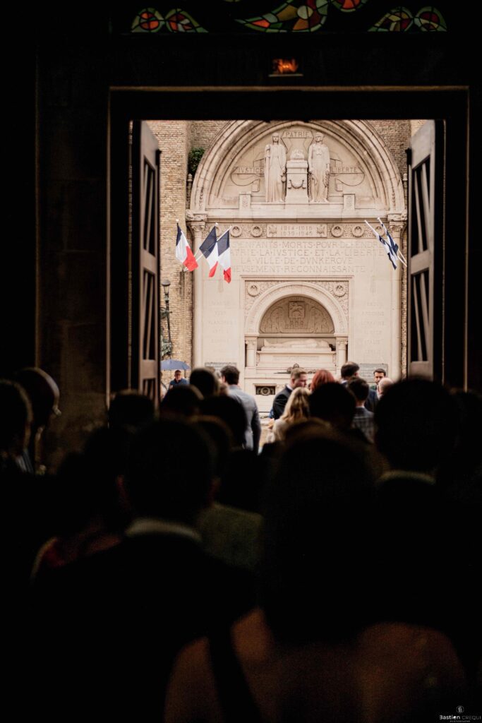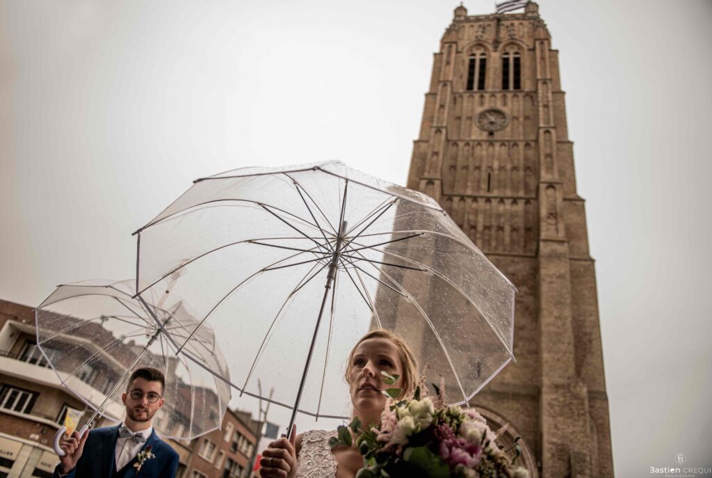A quelques pas de la place Charles Valentin, se trouve l’église Saint-Eloi, un édifice religieux du style gothique qui a résisté à de nombreuses guerres. Elle fait partie des trois beffrois que compose la ville de Dunkerque (c’est d’ailleurs unique en France). Le rassemblement du cortège s’est fait sous les parapluies. L’échange des consentements et des alliances se sont fait à l’église. L’accès à l’orge de l’église m’a donné l’occasion de monter faire un coucou à l’organiste. La pluie a son apparition pour la sortie de l’église mais cela météo capricieuse n’a pas gâchée la fête ! Astuce : si la pluie à des fortes chances de s’inviter à votre mariage, prévoyez un ou deux grand parapluies transparents.