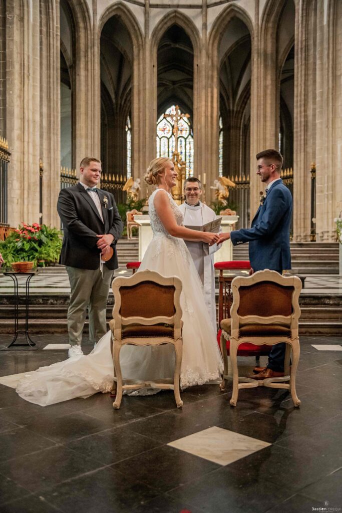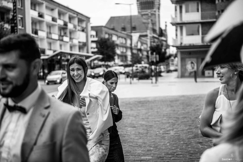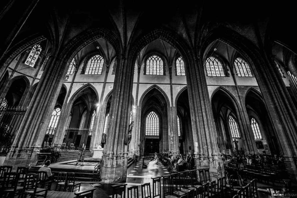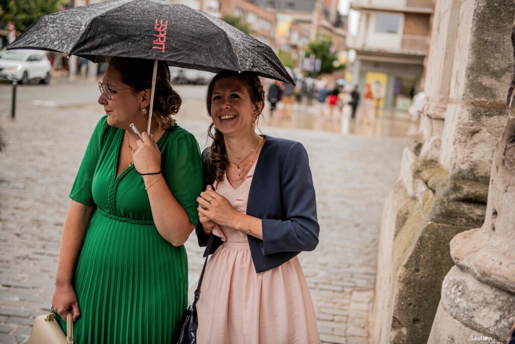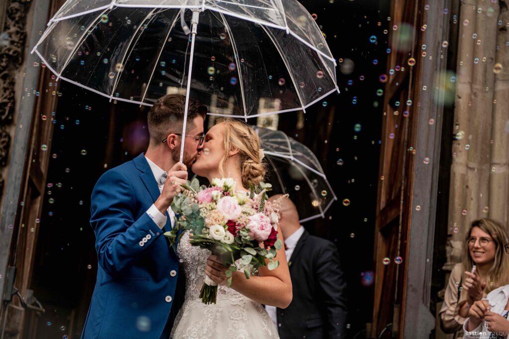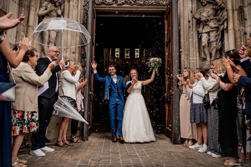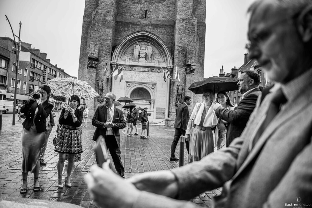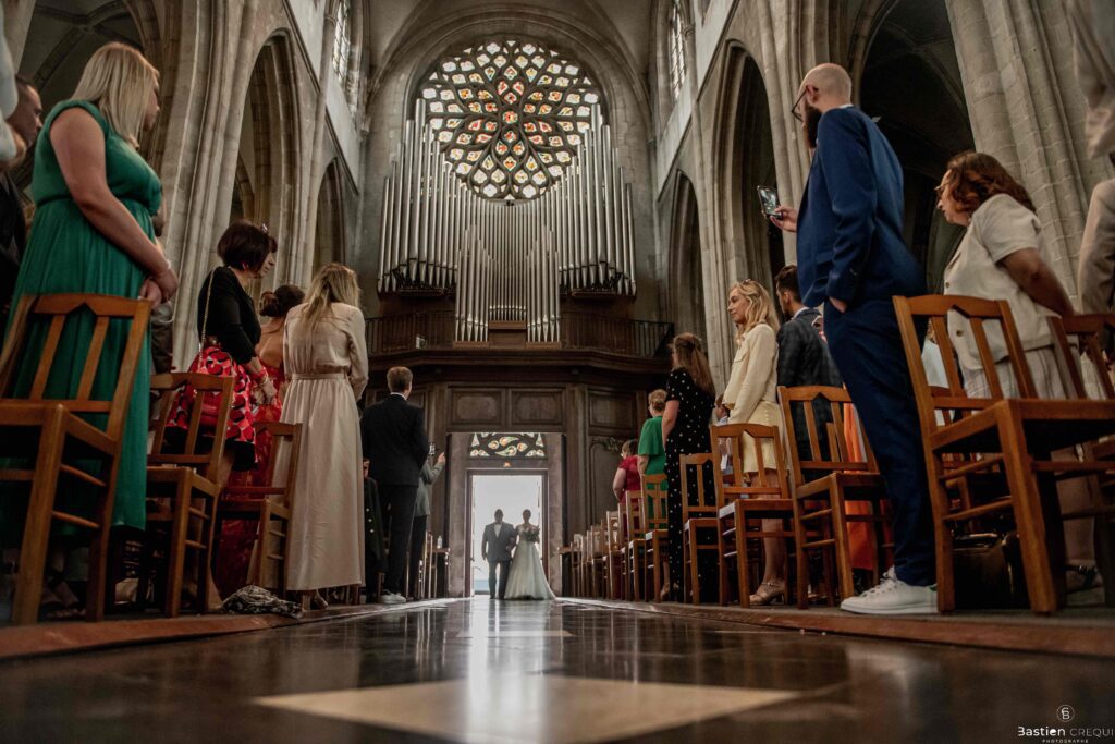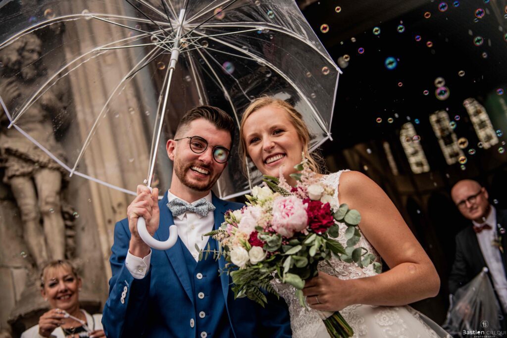 A quelques pas de la place Charles Valentin, se trouve l’église Saint-Eloi, un édifice religieux du style gothique qui a résisté à de nombreuses guerres. Elle fait partie des trois beffrois que compose la ville de Dunkerque (c’est d’ailleurs unique en France). Le rassemblement du cortège s’est fait sous les parapluies. L’échange des consentements et des alliances se sont fait à l’église. L’accès à l’orge de l’église m’a donné l’occasion de monter faire un coucou à l’organiste. La pluie a son apparition pour la sortie de l’église mais cela météo capricieuse n’a pas gâchée la fête ! Astuce : si la pluie à des fortes chances de s’inviter à votre mariage, prévoyez un ou deux grand parapluies transparents.