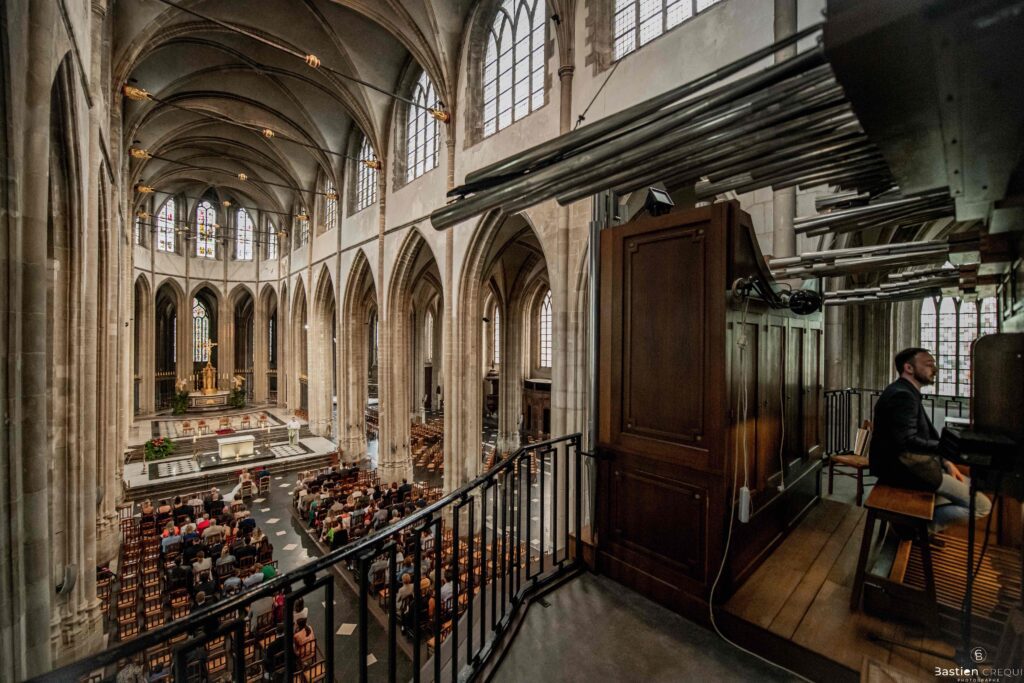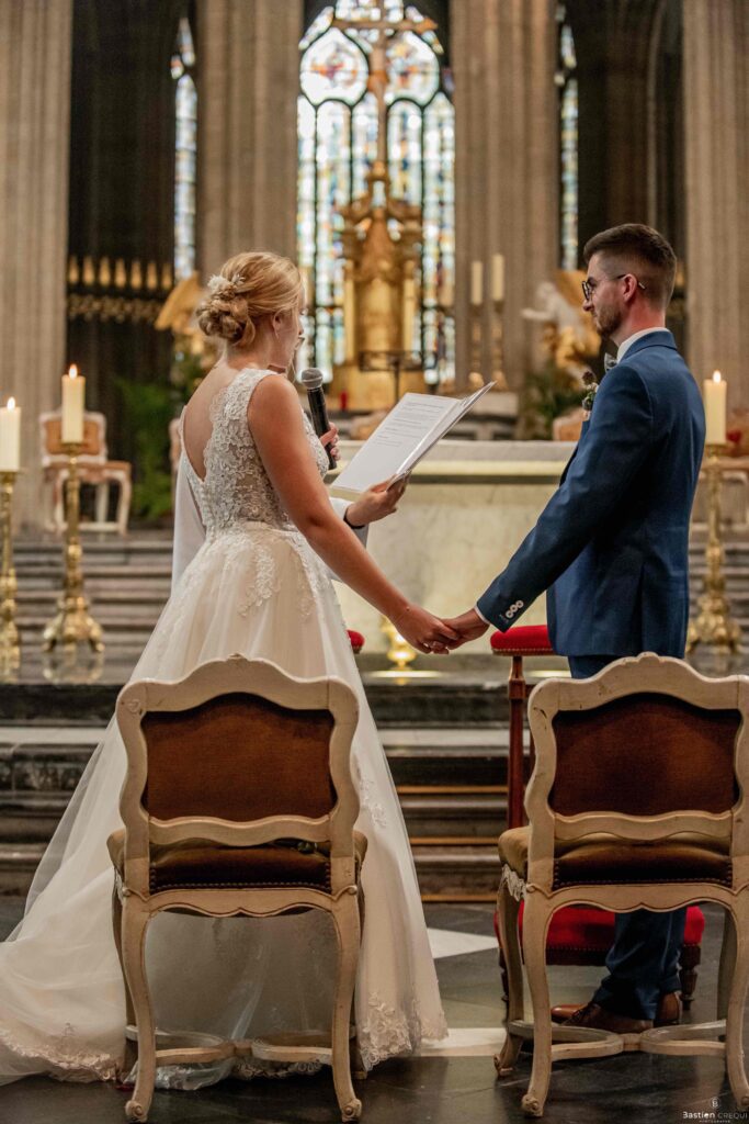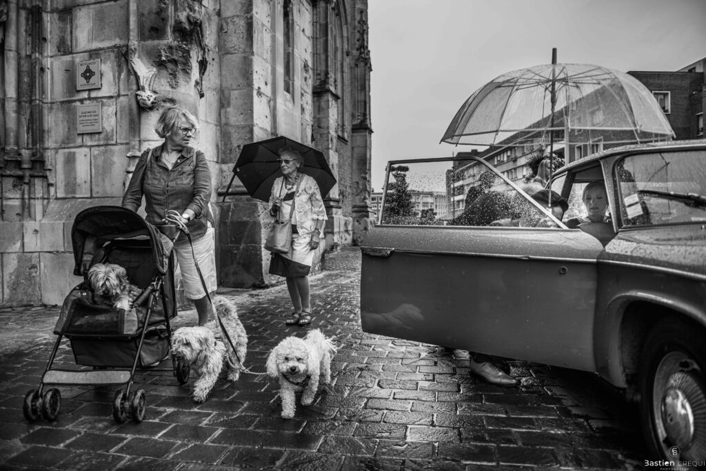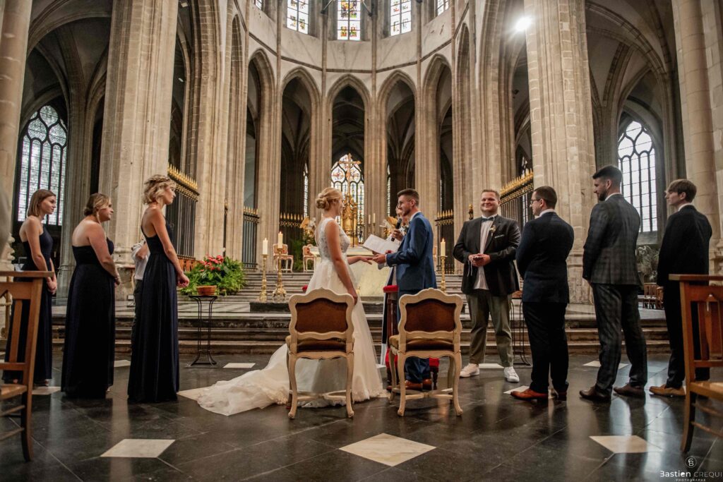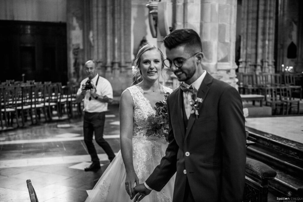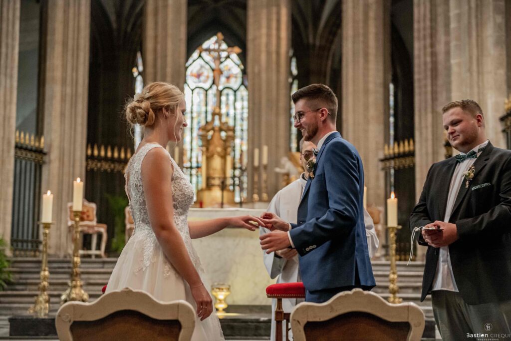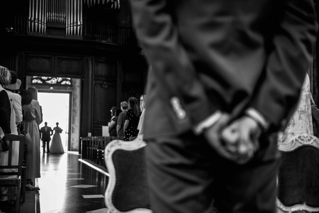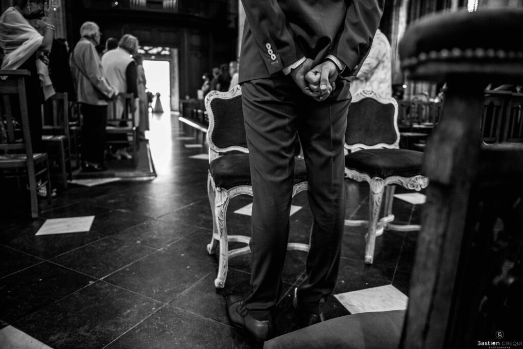 A quelques pas de la place Charles Valentin, se trouve l’église Saint-Eloi, un édifice religieux du style gothique qui a résisté à de nombreuses guerres. Elle fait partie des trois beffrois que compose la ville de Dunkerque (c’est d’ailleurs unique en France). Le rassemblement du cortège s’est fait sous les parapluies. L’échange des consentements et des alliances se sont fait à l’église. L’accès à l’orge de l’église m’a donné l’occasion de monter faire un coucou à l’organiste. La pluie a son apparition pour la sortie de l’église mais cela météo capricieuse n’a pas gâchée la fête ! Astuce : si la pluie à des fortes chances de s’inviter à votre mariage, prévoyez un ou deux grand parapluies transparents.