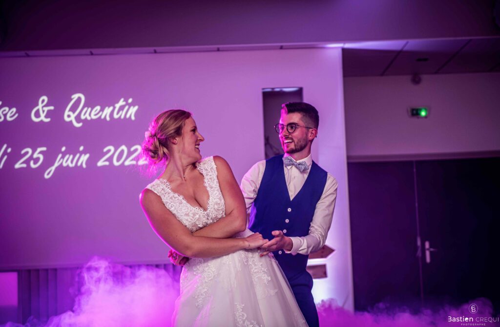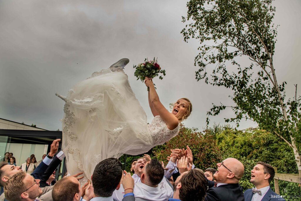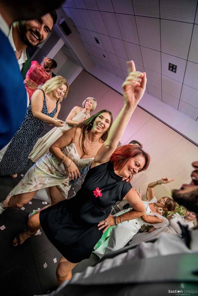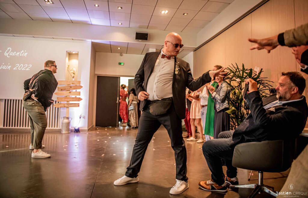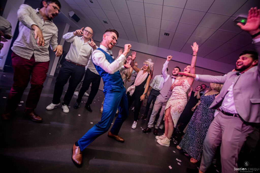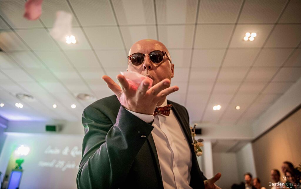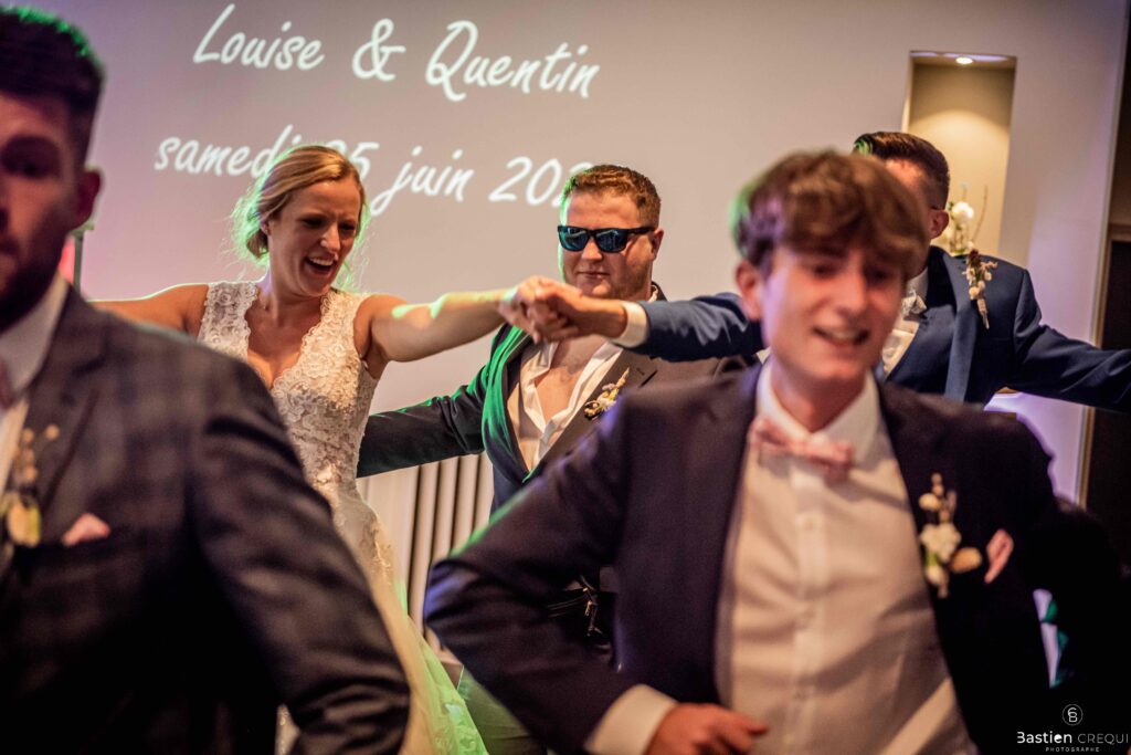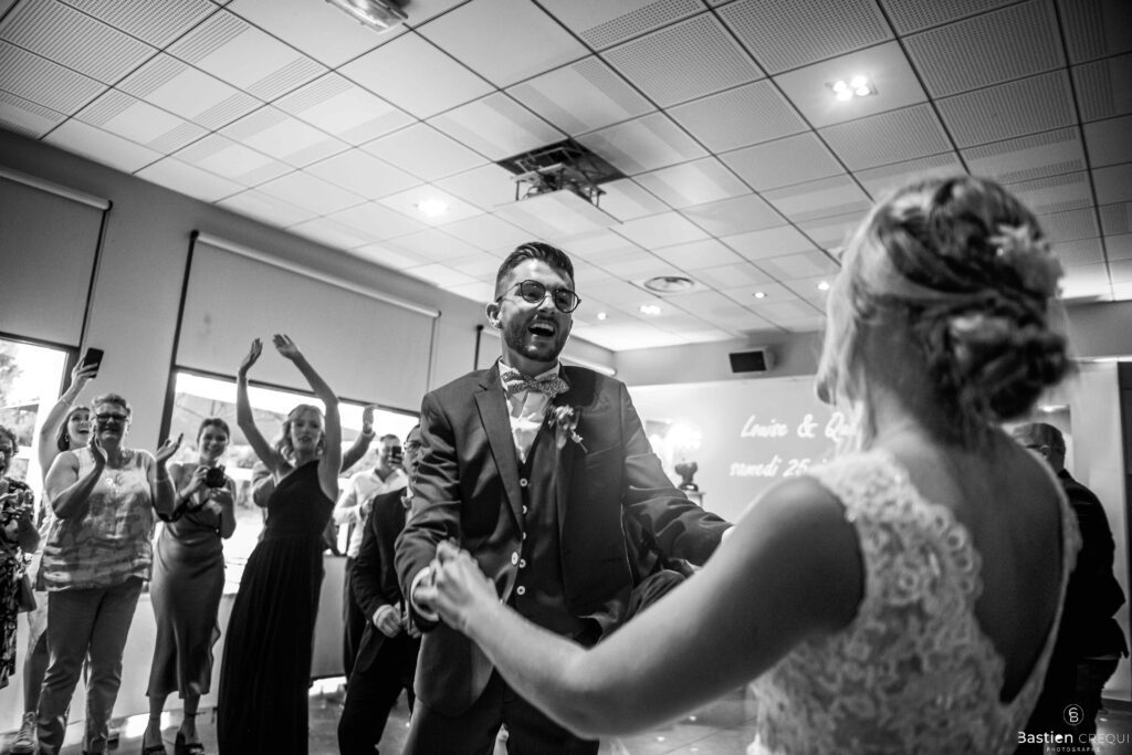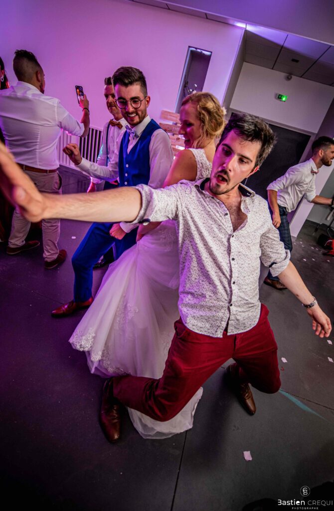 Après les cérémonies officielles, nous nous dirigeâmes vers La Villa blanche à Coudekerque-Branche. Le vin d’honneur s’est déroulé la plupart du temps à l’intérieur ça cause d’une pluie fine. La Villa Blanche est une salle de réception contemporaine situé à 5mn de Dunkerque et à 40mn de Lille. Elle est dotée d’une structure intérieure modulable, l’espace s’adapte selon la configuration de votre mariage. Une verrière existe pour célébrer une cérémonie laïque. La soirée a été folle ! Elle a débuté par l’entrée de deux flowers boy, savez-vous ce qu’est un flower boy ? C’est un ami des mariés qui est chargé de jeter des pétales de fleurs avant l’arrivée des mariés, souvent à partir d’une banane vintage attachée à sa taille. Les invités ont été surpris avec des animations à faire mourir de rire les jeunes mariés ! DB animation a ensuite déroulé sa playlist pour assurer l’ambiance de folie sur la piste de danse. C’était un plaisir de couvrir ce mariage dans cette ambiance survoltée.