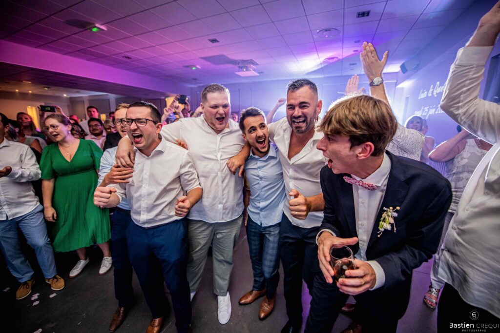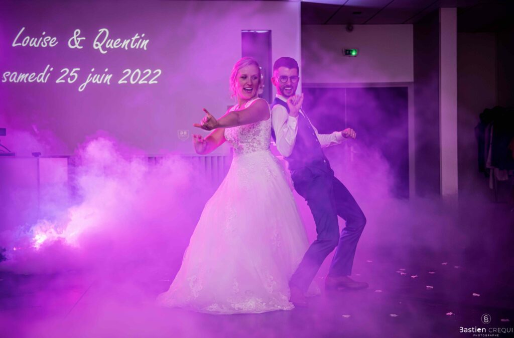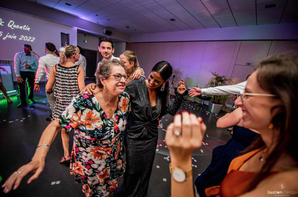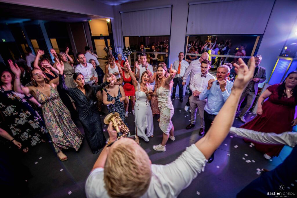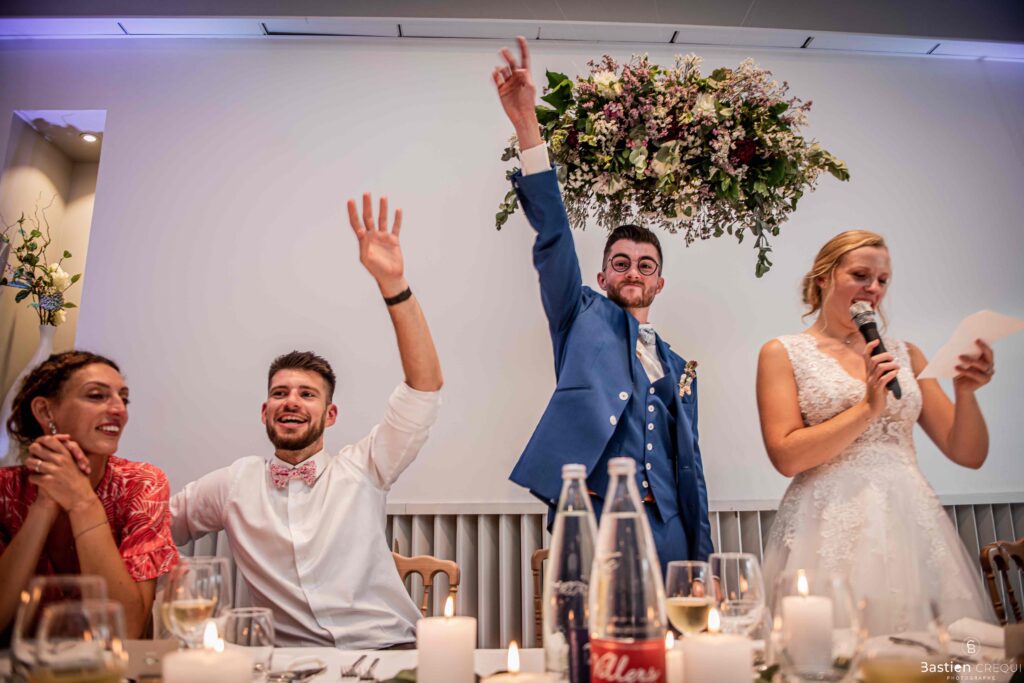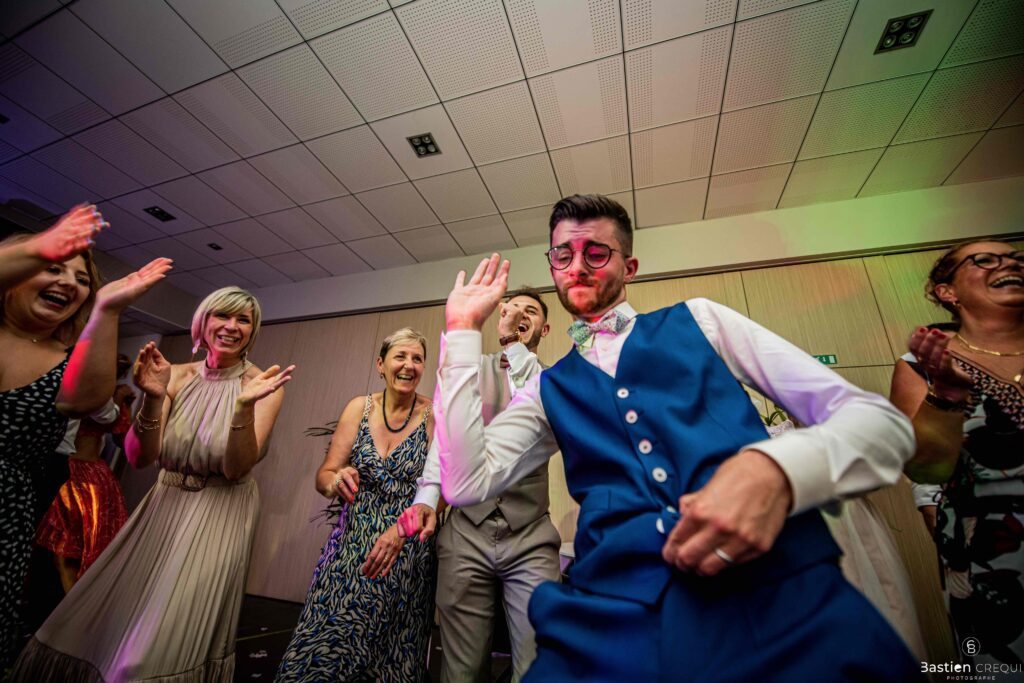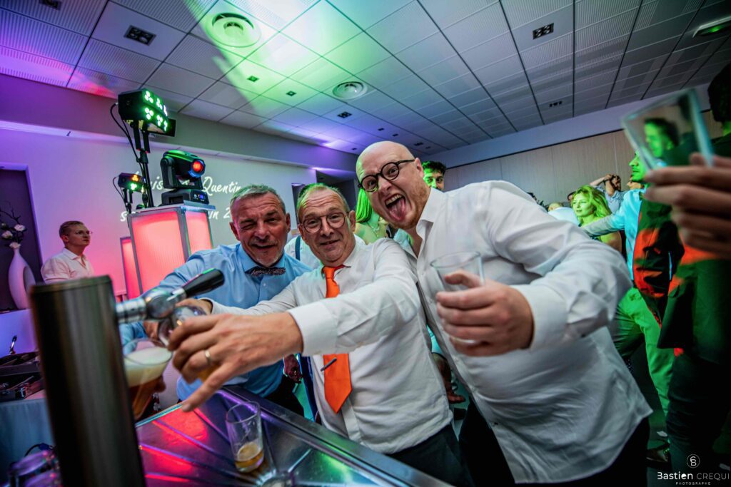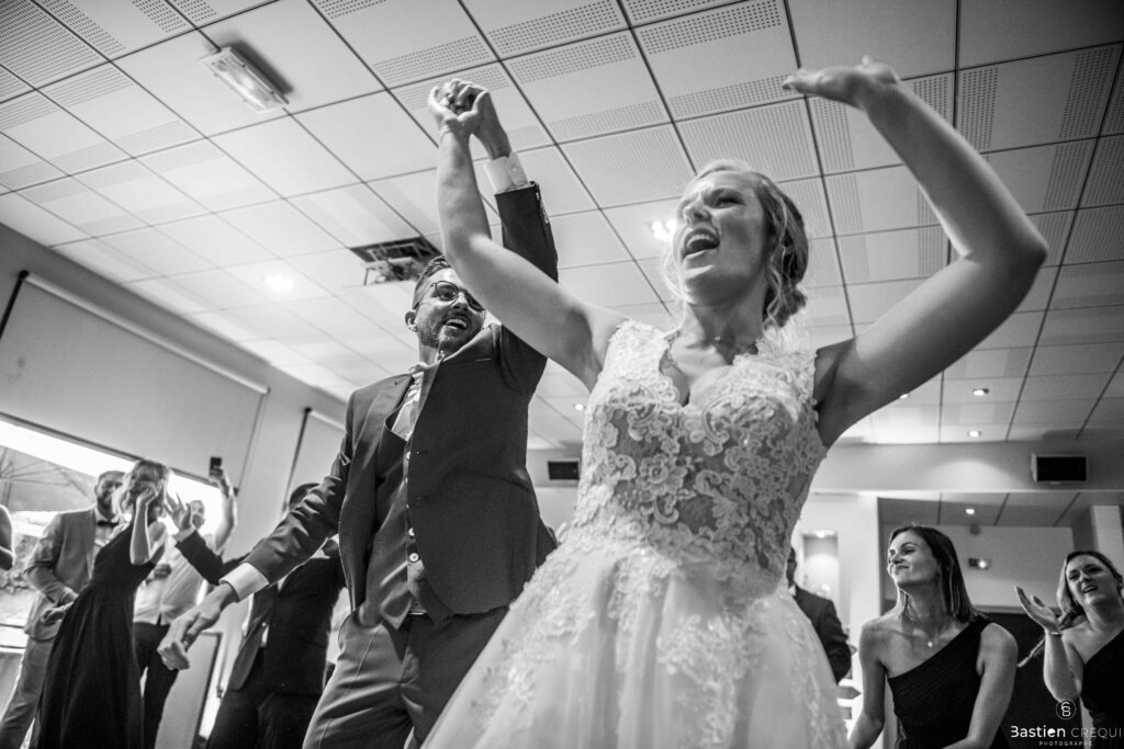 Après les cérémonies officielles, nous nous dirigeâmes vers La Villa blanche à Coudekerque-Branche. Le vin d’honneur s’est déroulé la plupart du temps à l’intérieur ça cause d’une pluie fine. La Villa Blanche est une salle de réception contemporaine situé à 5mn de Dunkerque et à 40mn de Lille. Elle est dotée d’une structure intérieure modulable, l’espace s’adapte selon la configuration de votre mariage. Une verrière existe pour célébrer une cérémonie laïque. La soirée a été folle ! Elle a débuté par l’entrée de deux flowers boy, savez-vous ce qu’est un flower boy ? C’est un ami des mariés qui est chargé de jeter des pétales de fleurs avant l’arrivée des mariés, souvent à partir d’une banane vintage attachée à sa taille. Les invités ont été surpris avec des animations à faire mourir de rire les jeunes mariés ! DB animation a ensuite déroulé sa playlist pour assurer l’ambiance de folie sur la piste de danse. C’était un plaisir de couvrir ce mariage dans cette ambiance survoltée.