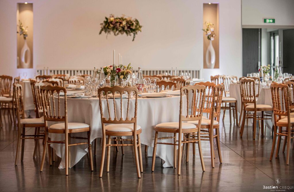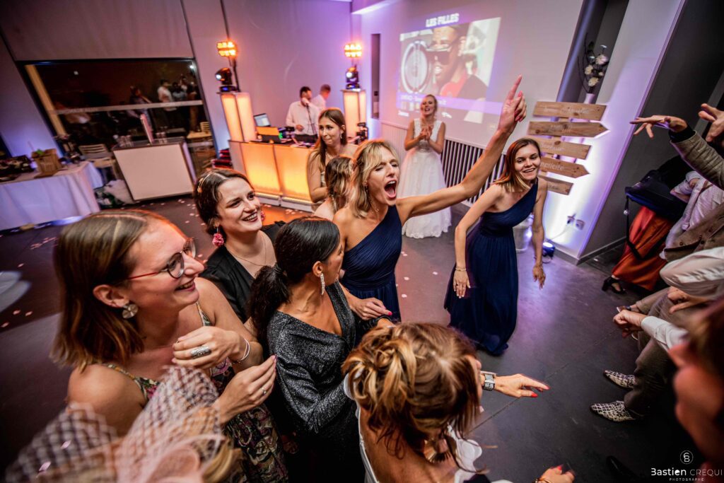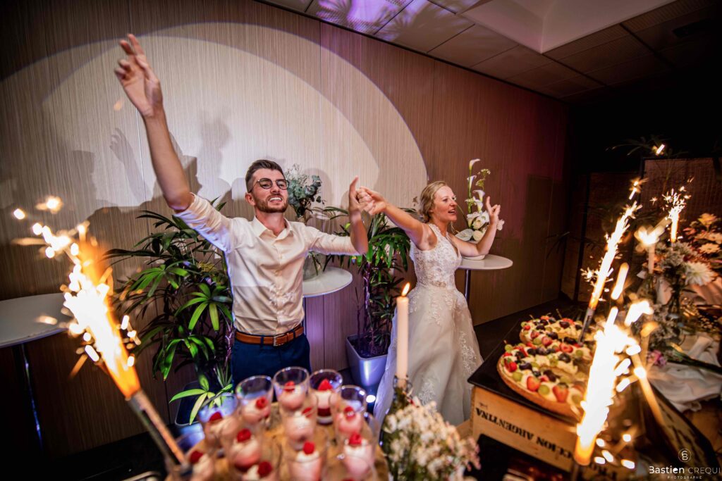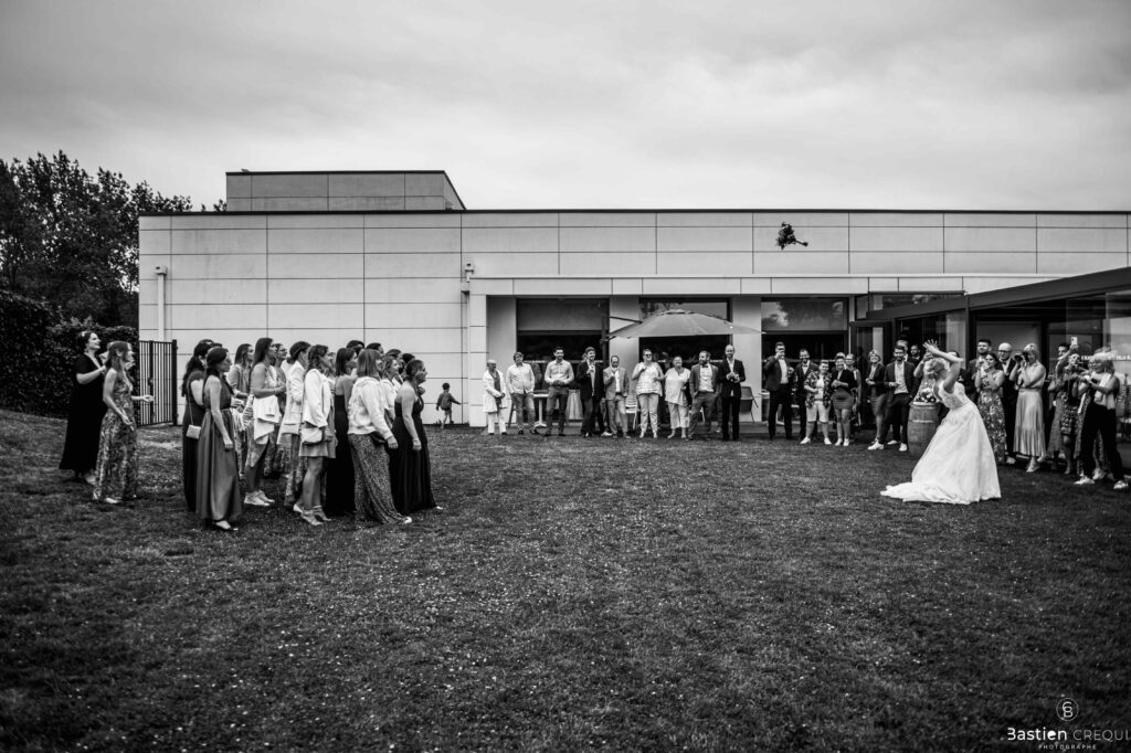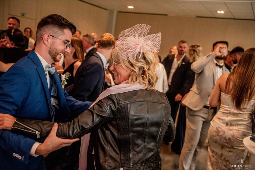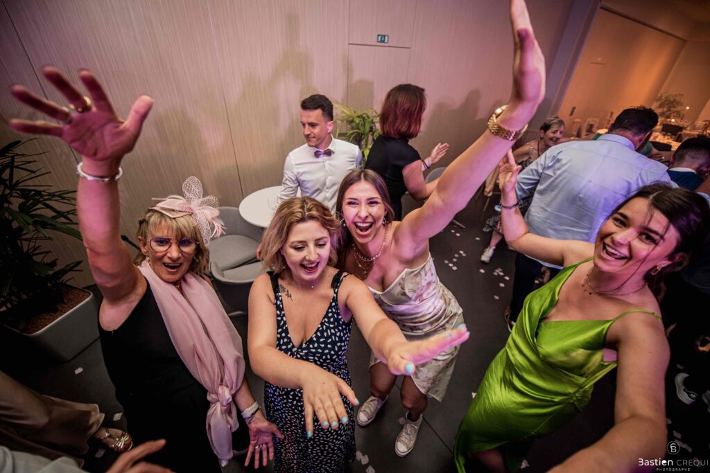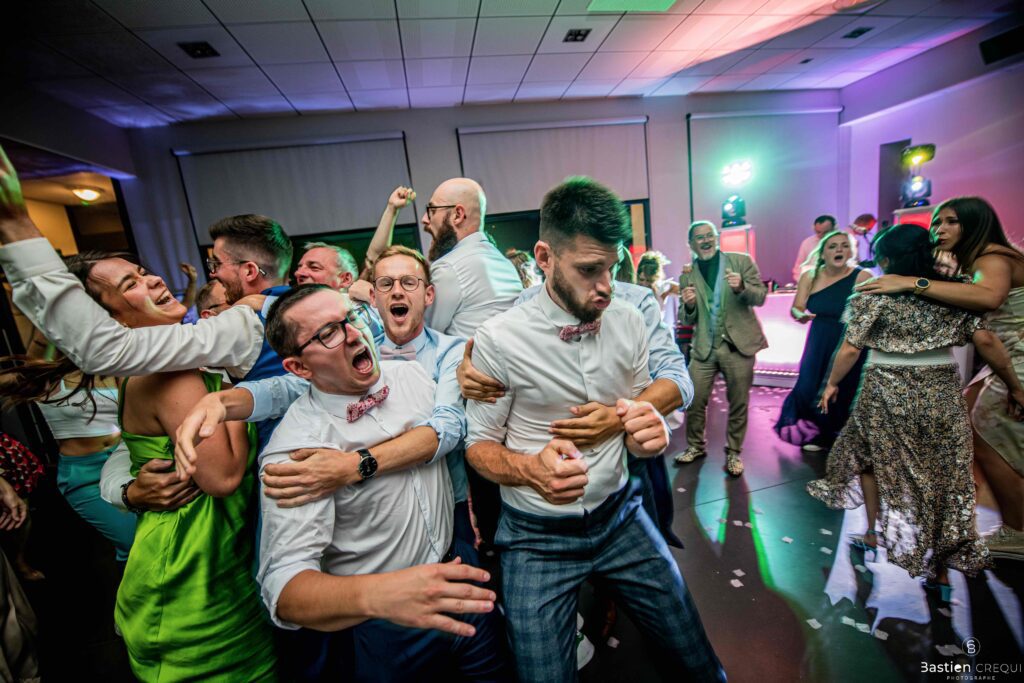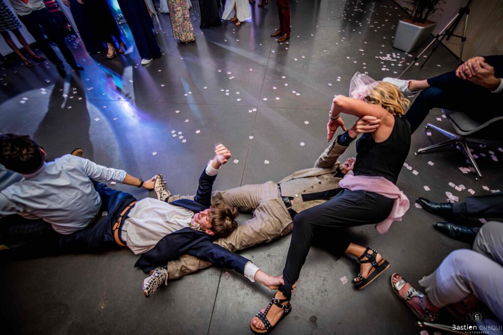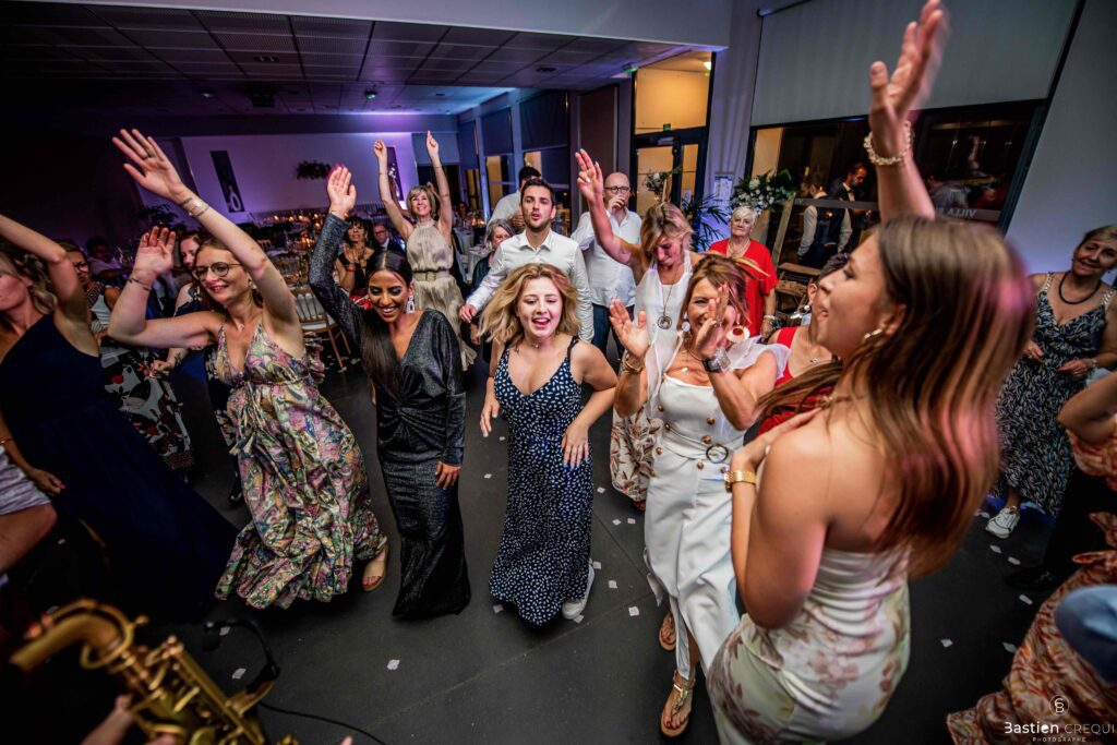 Après les cérémonies officielles, nous nous dirigeâmes vers La Villa blanche à Coudekerque-Branche. Le vin d’honneur s’est déroulé la plupart du temps à l’intérieur ça cause d’une pluie fine. La Villa Blanche est une salle de réception contemporaine situé à 5mn de Dunkerque et à 40mn de Lille. Elle est dotée d’une structure intérieure modulable, l’espace s’adapte selon la configuration de votre mariage. Une verrière existe pour célébrer une cérémonie laïque. La soirée a été folle ! Elle a débuté par l’entrée de deux flowers boy, savez-vous ce qu’est un flower boy ? C’est un ami des mariés qui est chargé de jeter des pétales de fleurs avant l’arrivée des mariés, souvent à partir d’une banane vintage attachée à sa taille. Les invités ont été surpris avec des animations à faire mourir de rire les jeunes mariés ! DB animation a ensuite déroulé sa playlist pour assurer l’ambiance de folie sur la piste de danse. C’était un plaisir de couvrir ce mariage dans cette ambiance survoltée.