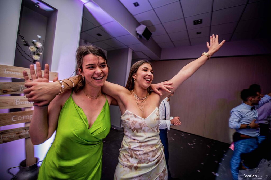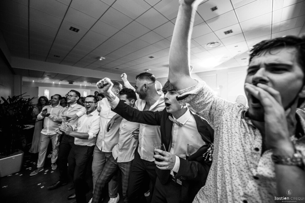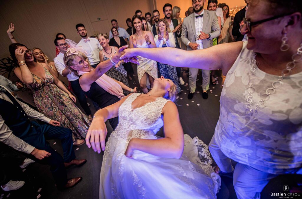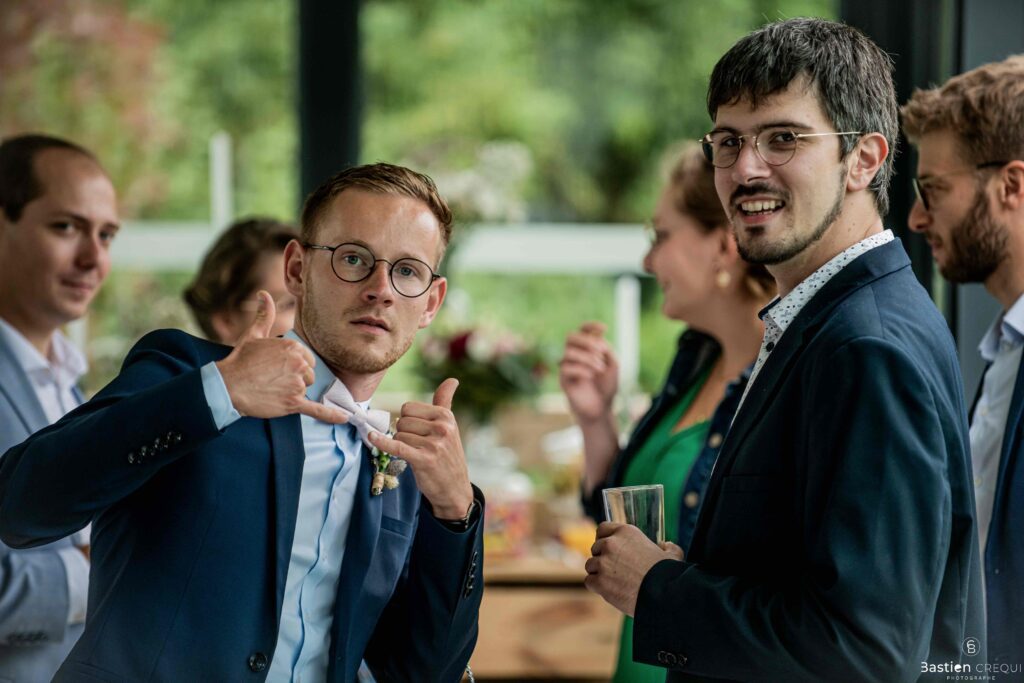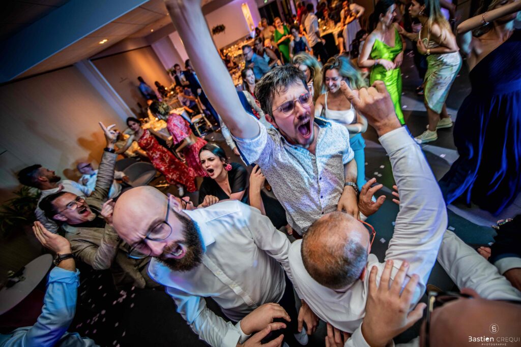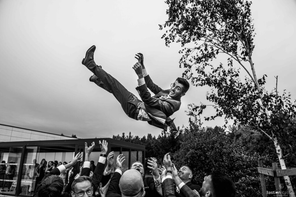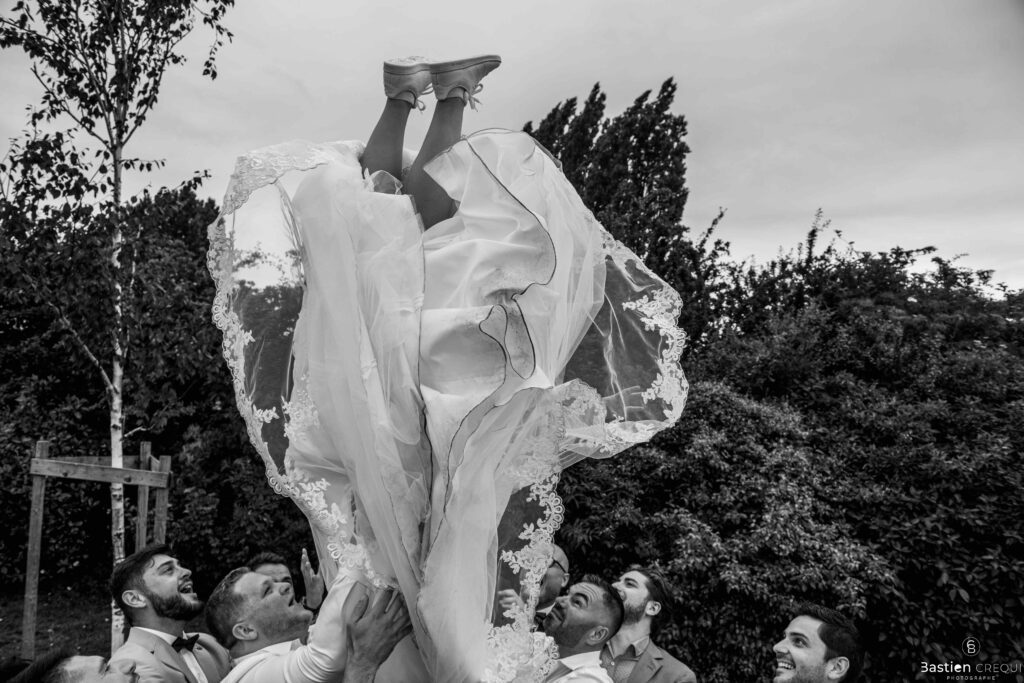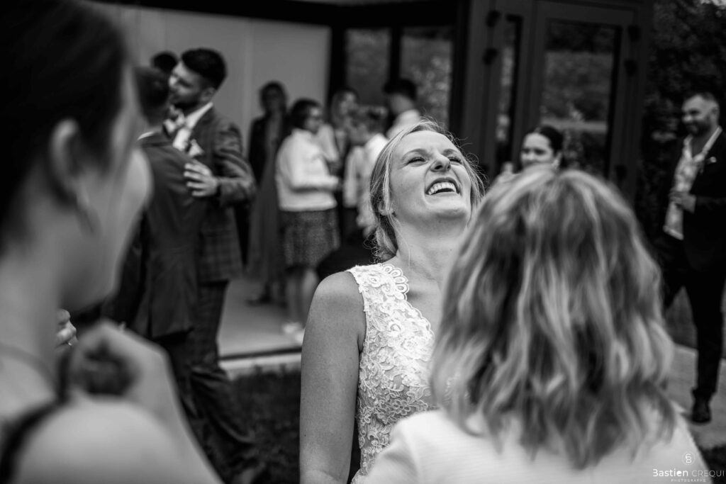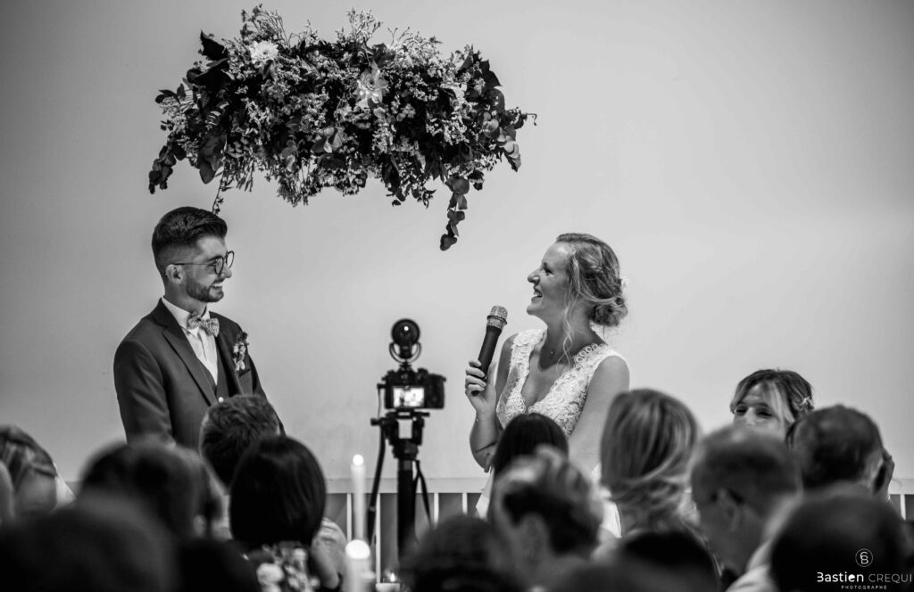 Après les cérémonies officielles, nous nous dirigeâmes vers La Villa blanche à Coudekerque-Branche. Le vin d’honneur s’est déroulé la plupart du temps à l’intérieur ça cause d’une pluie fine. La Villa Blanche est une salle de réception contemporaine situé à 5mn de Dunkerque et à 40mn de Lille. Elle est dotée d’une structure intérieure modulable, l’espace s’adapte selon la configuration de votre mariage. Une verrière existe pour célébrer une cérémonie laïque. La soirée a été folle ! Elle a débuté par l’entrée de deux flowers boy, savez-vous ce qu’est un flower boy ? C’est un ami des mariés qui est chargé de jeter des pétales de fleurs avant l’arrivée des mariés, souvent à partir d’une banane vintage attachée à sa taille. Les invités ont été surpris avec des animations à faire mourir de rire les jeunes mariés ! DB animation a ensuite déroulé sa playlist pour assurer l’ambiance de folie sur la piste de danse. C’était un plaisir de couvrir ce mariage dans cette ambiance survoltée.