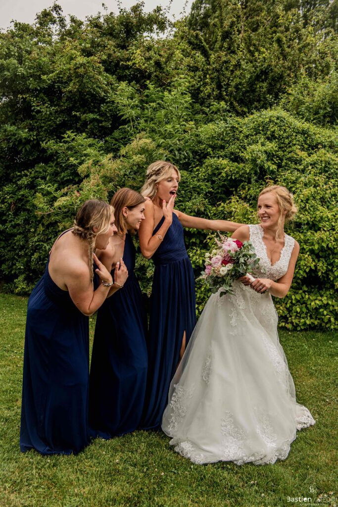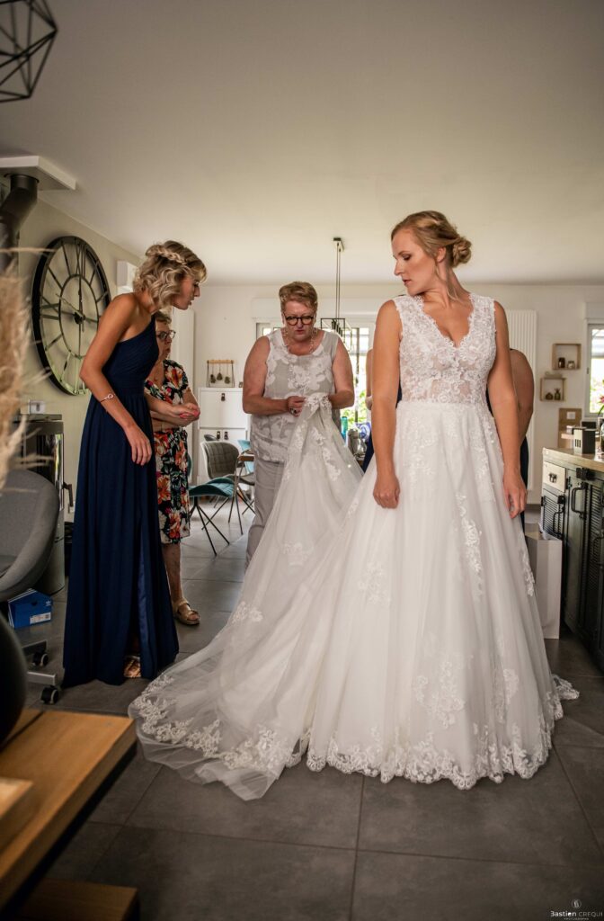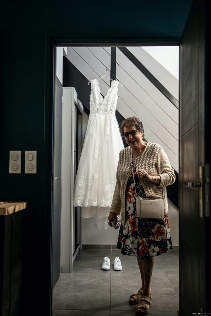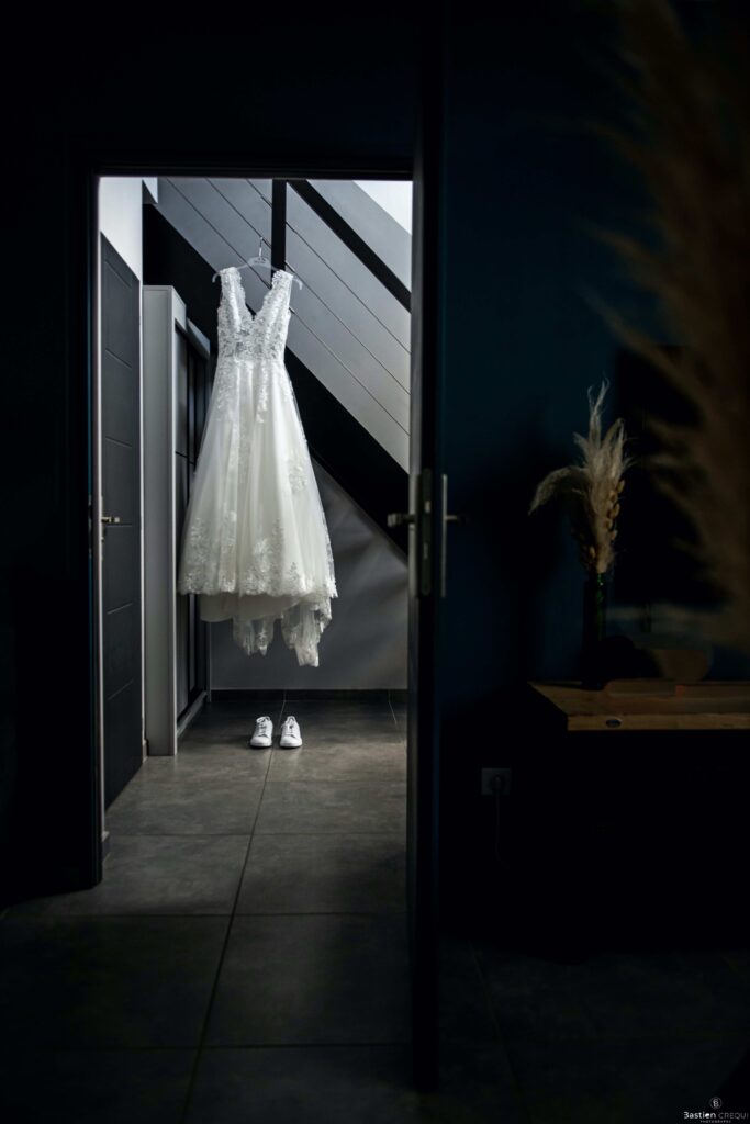 Louise déteste les talons alors, oui, elle a porté des Stan Smith pour être à l’aise et surtout pour être elle-même. Ses proches sont arrivés et elle a enfilé sa robe Justeunbaiserdunkerque en compagnie de ses proches, témoins et demoiselles d’honneur.